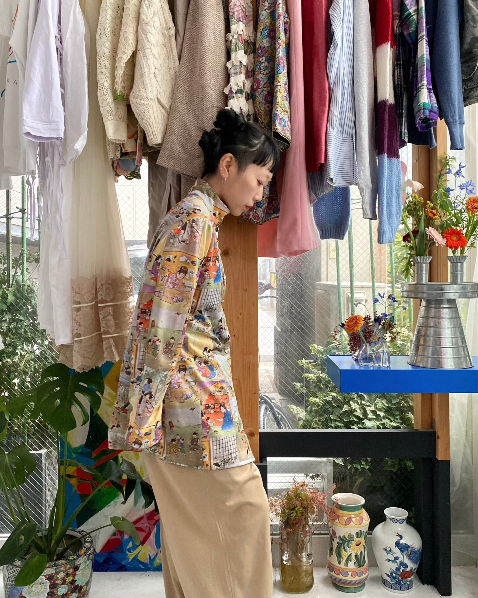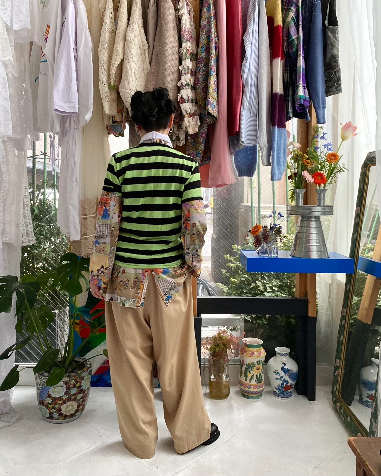 インパクトの強い柄物はレイヤードして、見せる面積を調整すると主張しすぎず◎