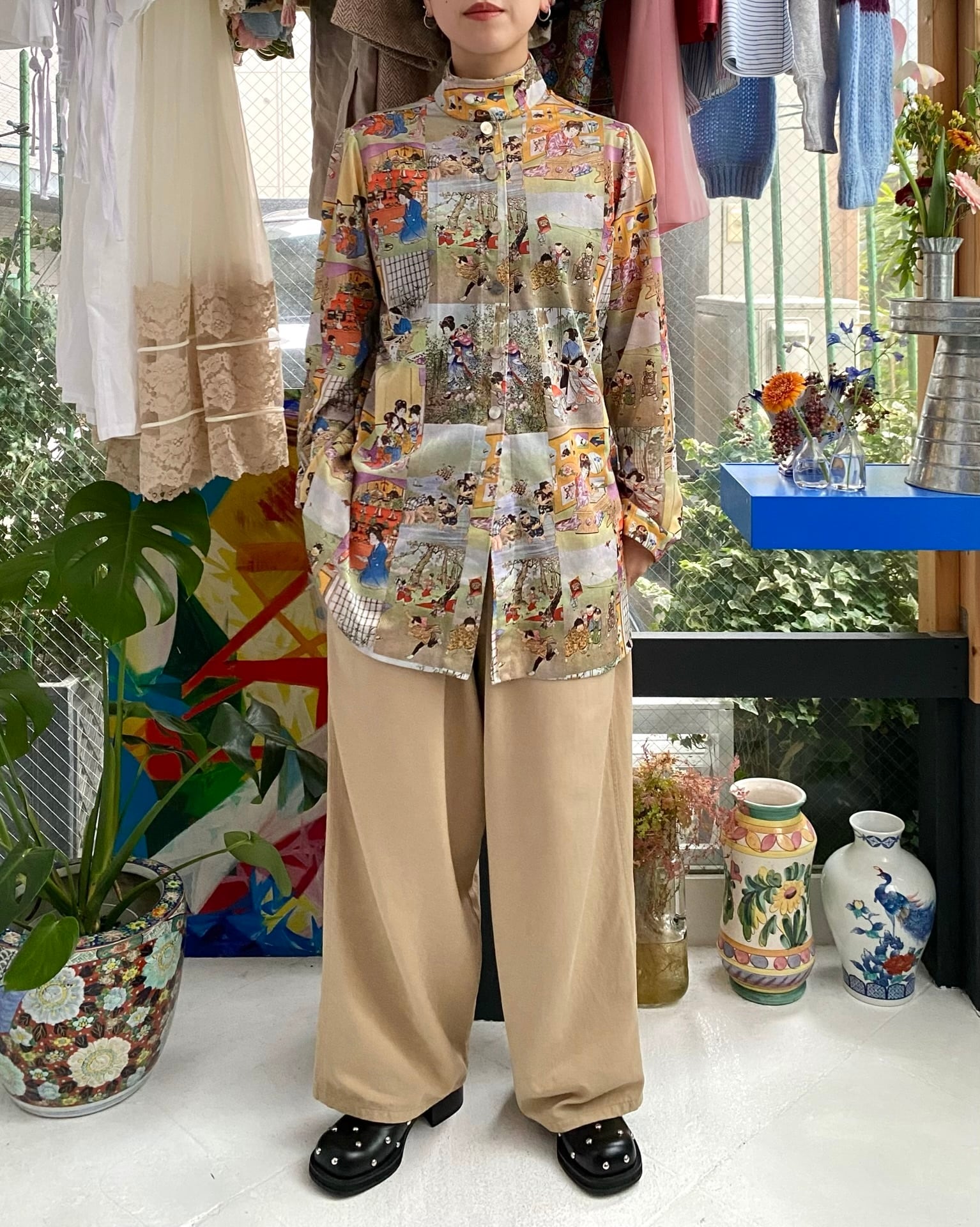 70sに多く生産されるようになった、ポリエステル素材にプリントしハンドメイドで作られている唯一無二の総柄シャツです。