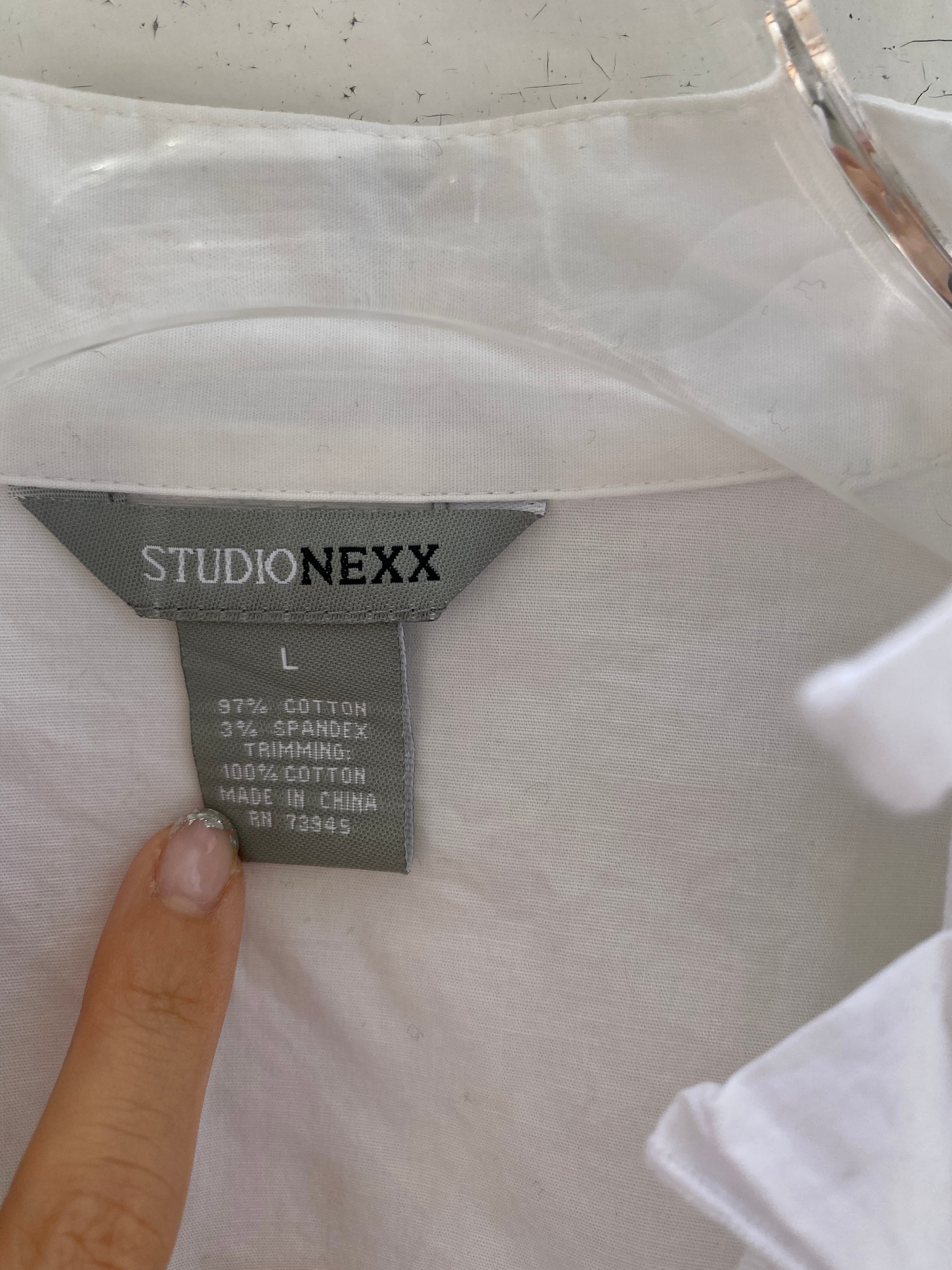 深いVネックの胸元にリボンモチーフの装飾があしらわれたデザインブラウス。