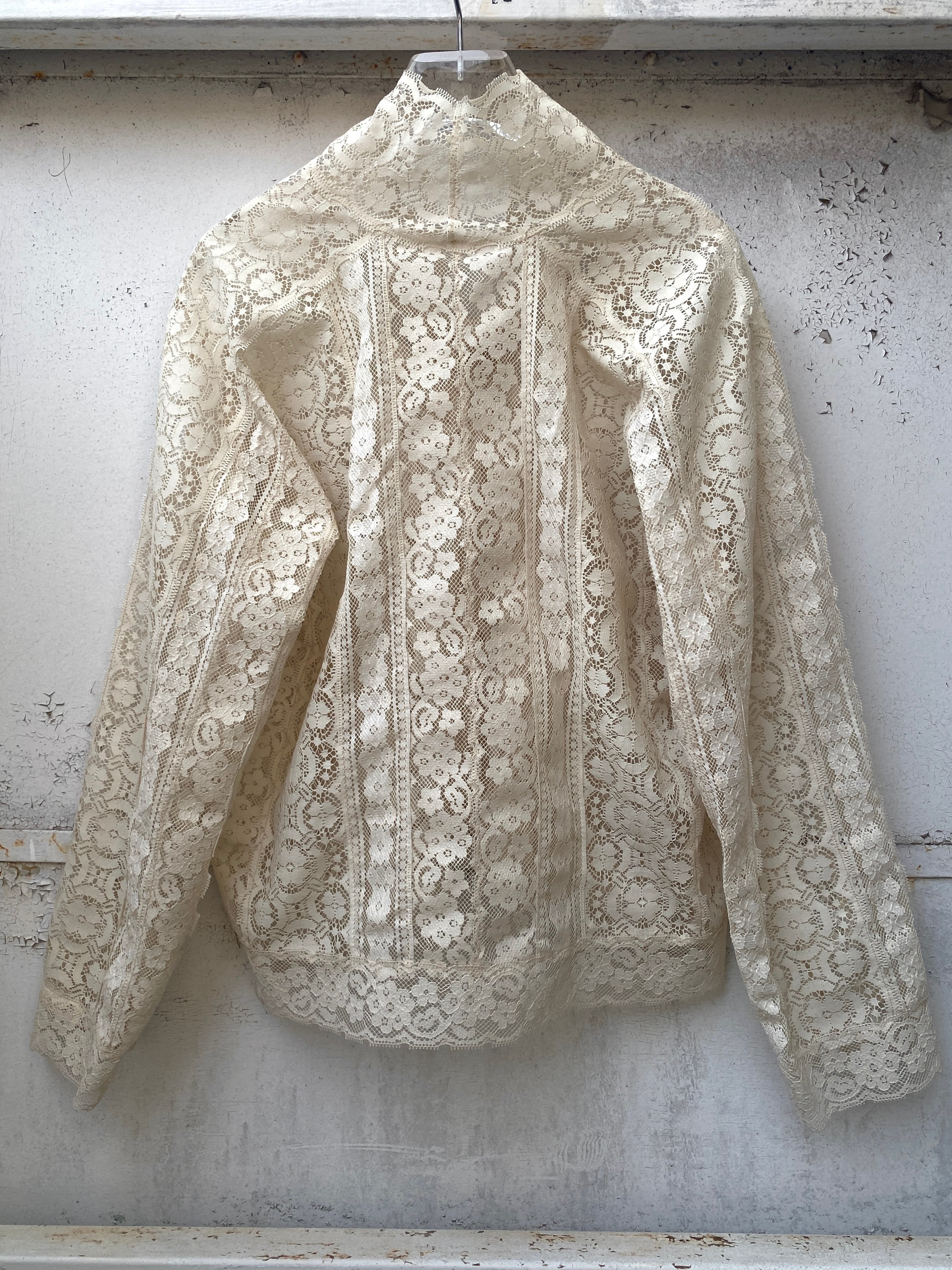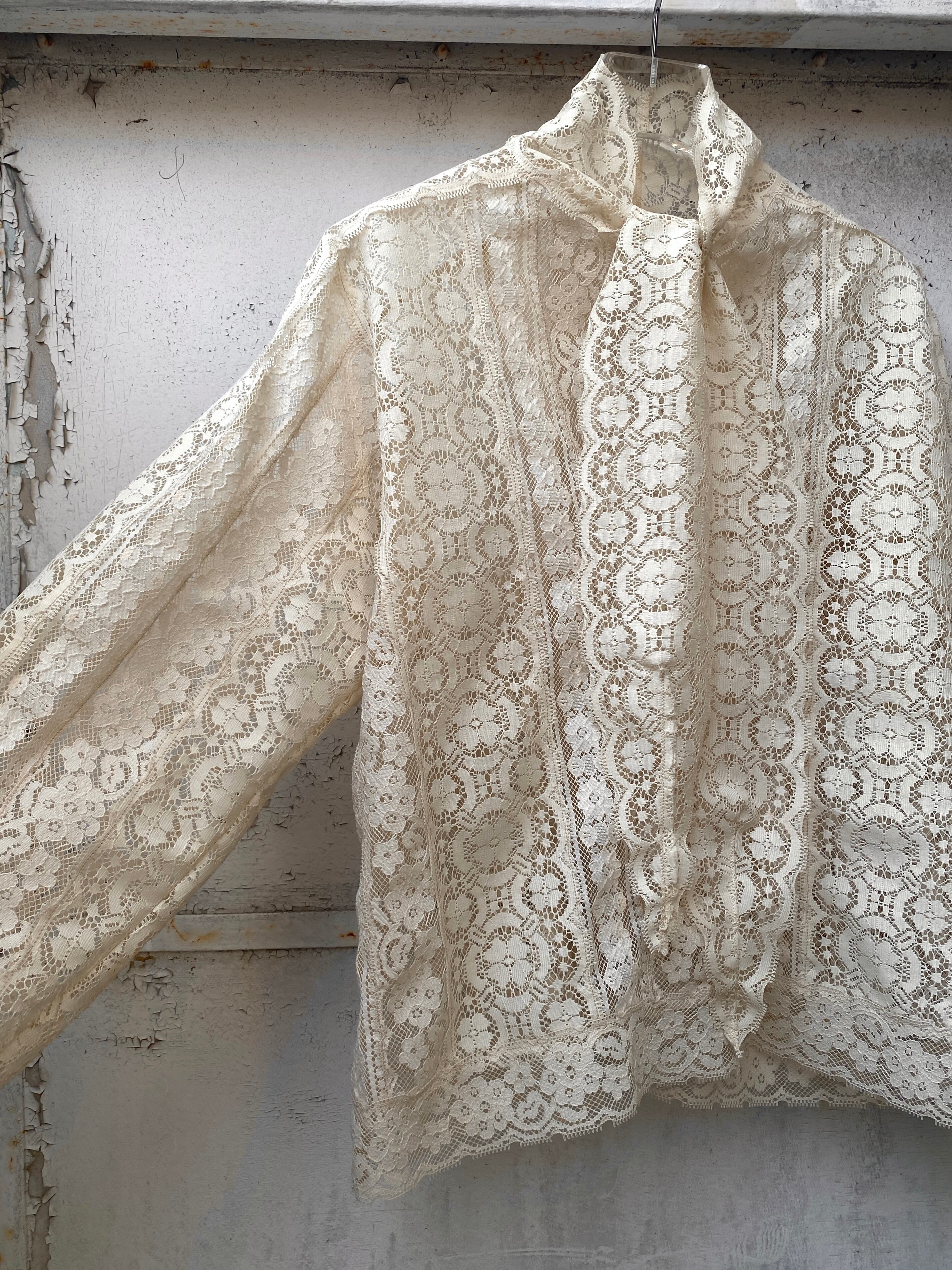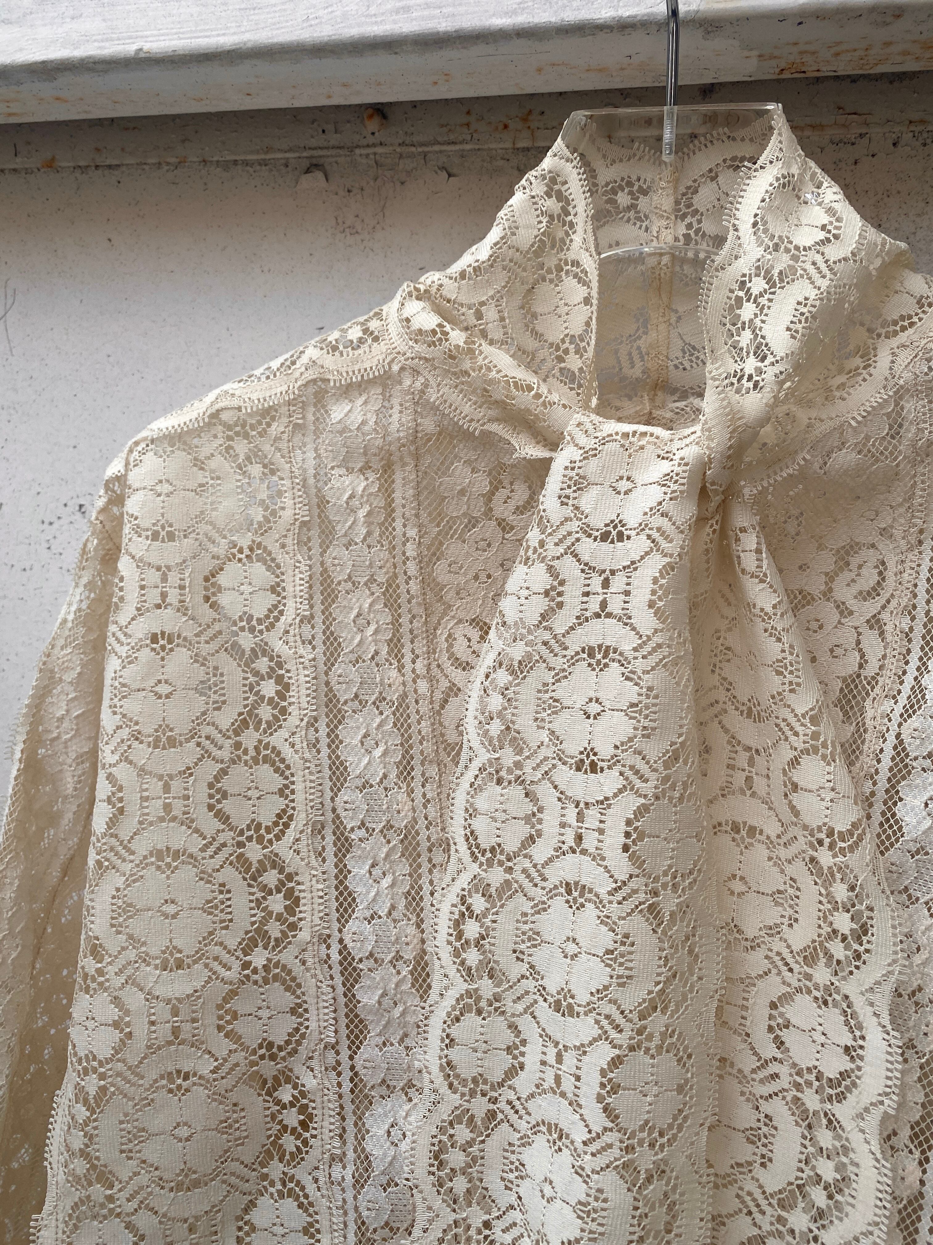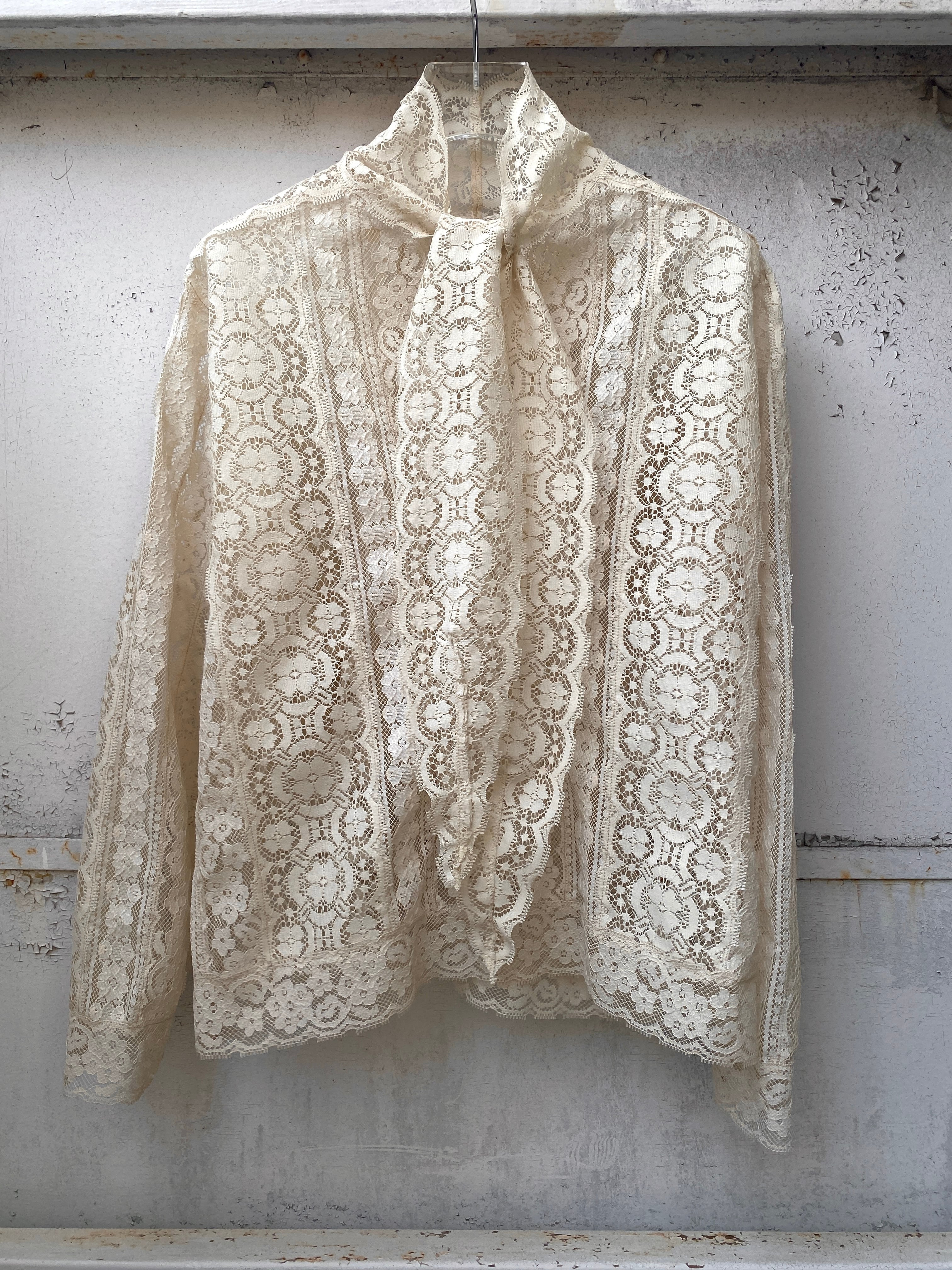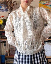 複数の様々な幅と柄のリボンを組み合わせて作り上げたハンドメイドのブラウス。