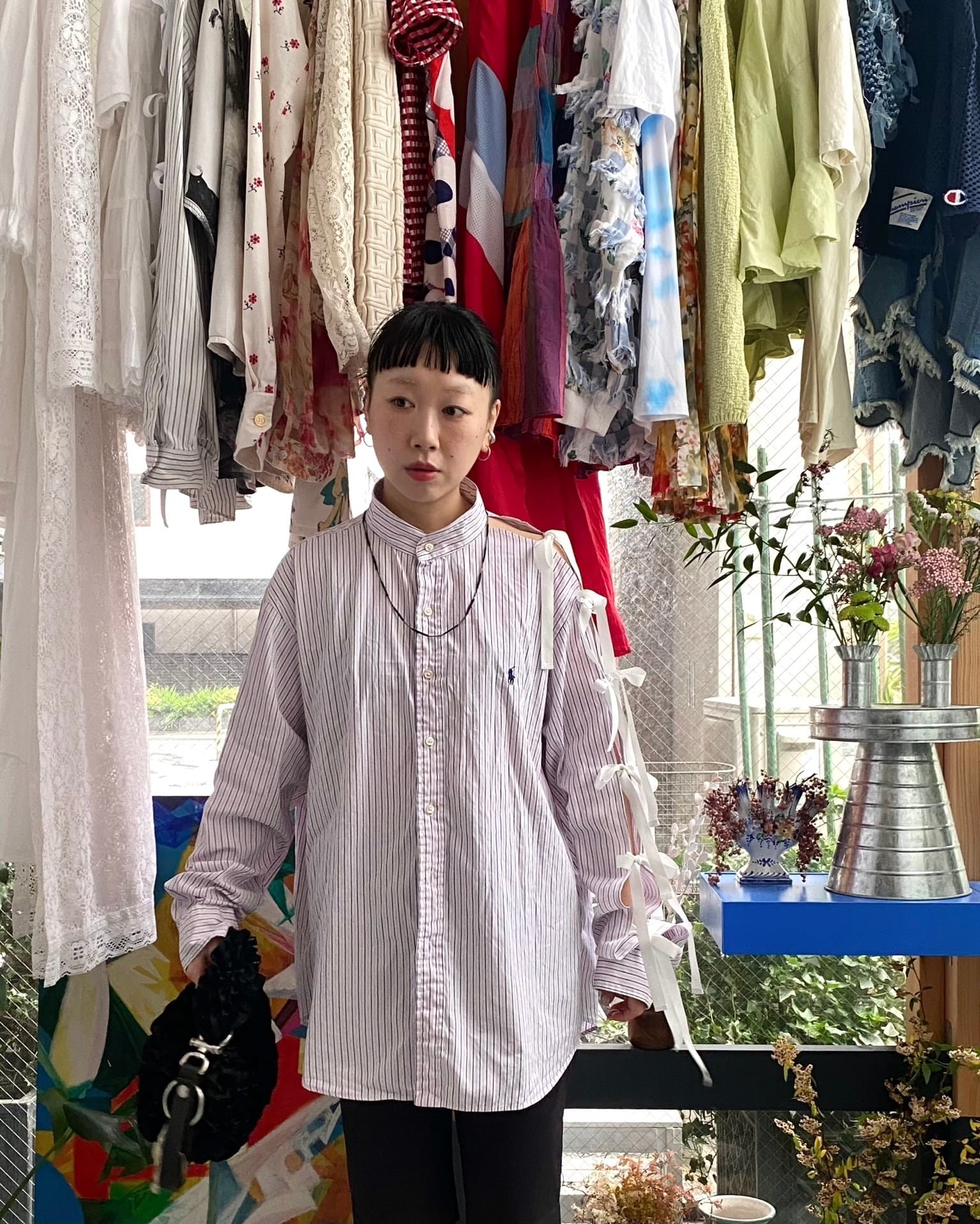 メンズのラルフローレンシャツをベースに、片袖のスリットにリボンをつけたデザインのリメイクシャツ。