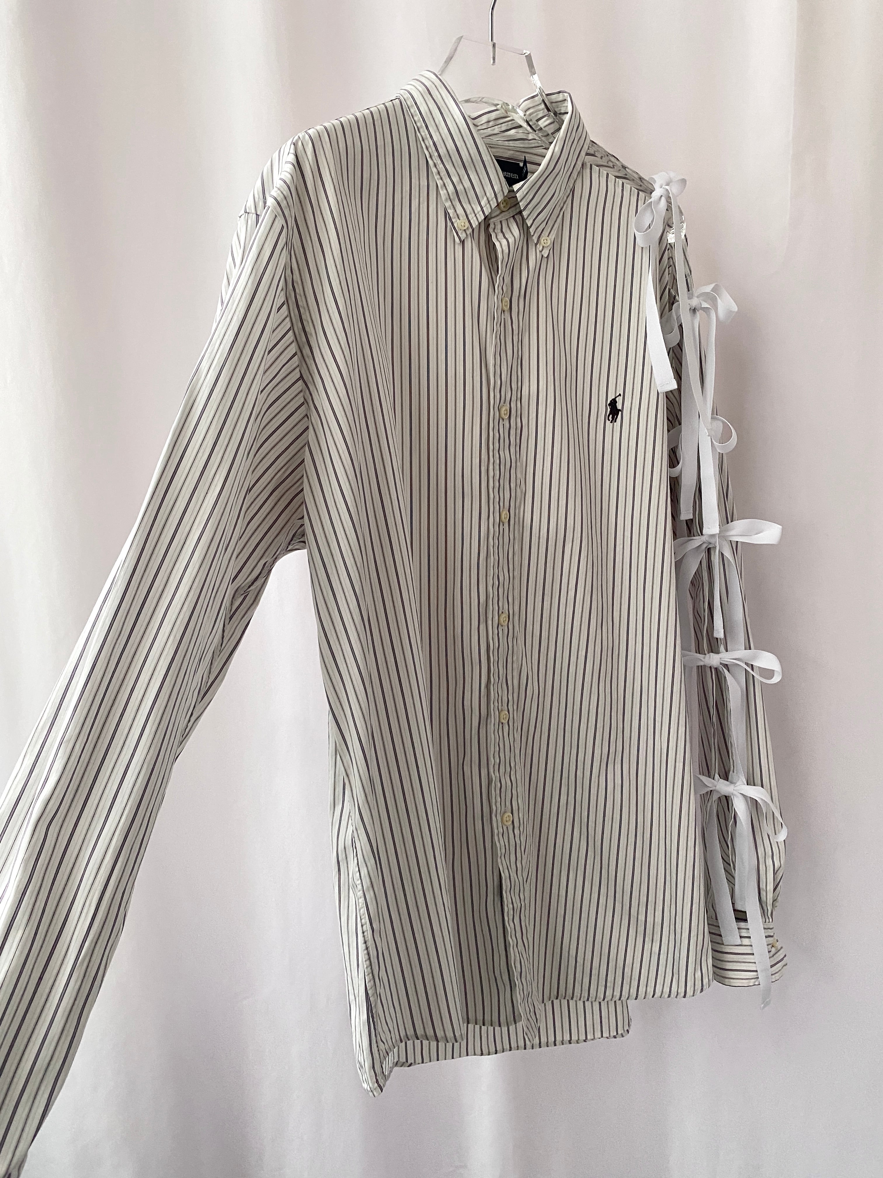 メンズのラルフローレンシャツをベースに、片袖のスリットにリボンをつけたデザインのリメイクシャツ。