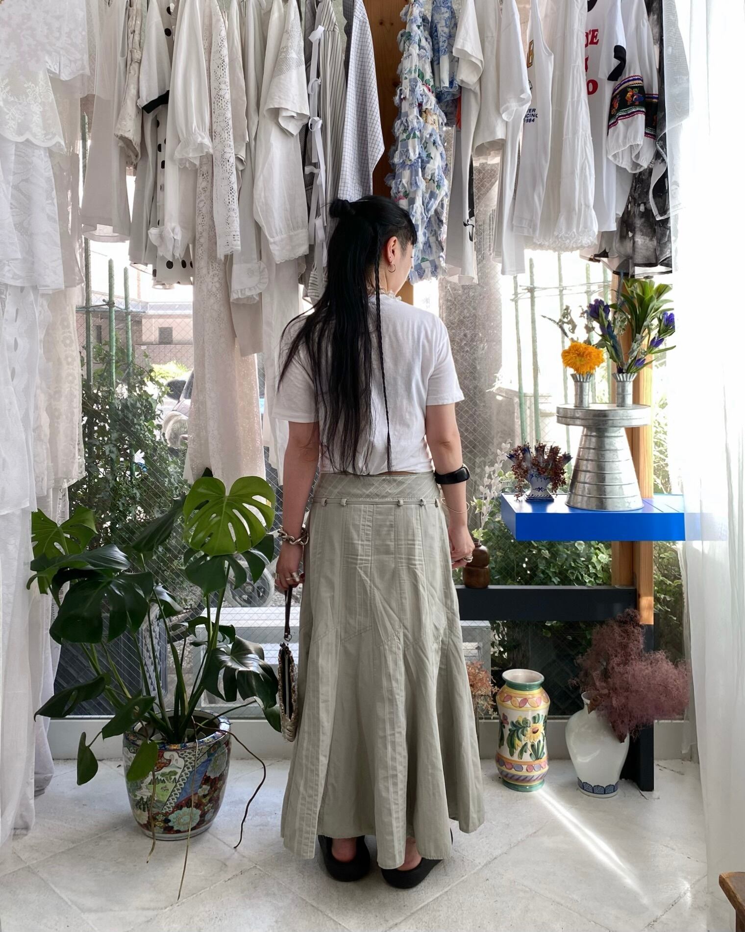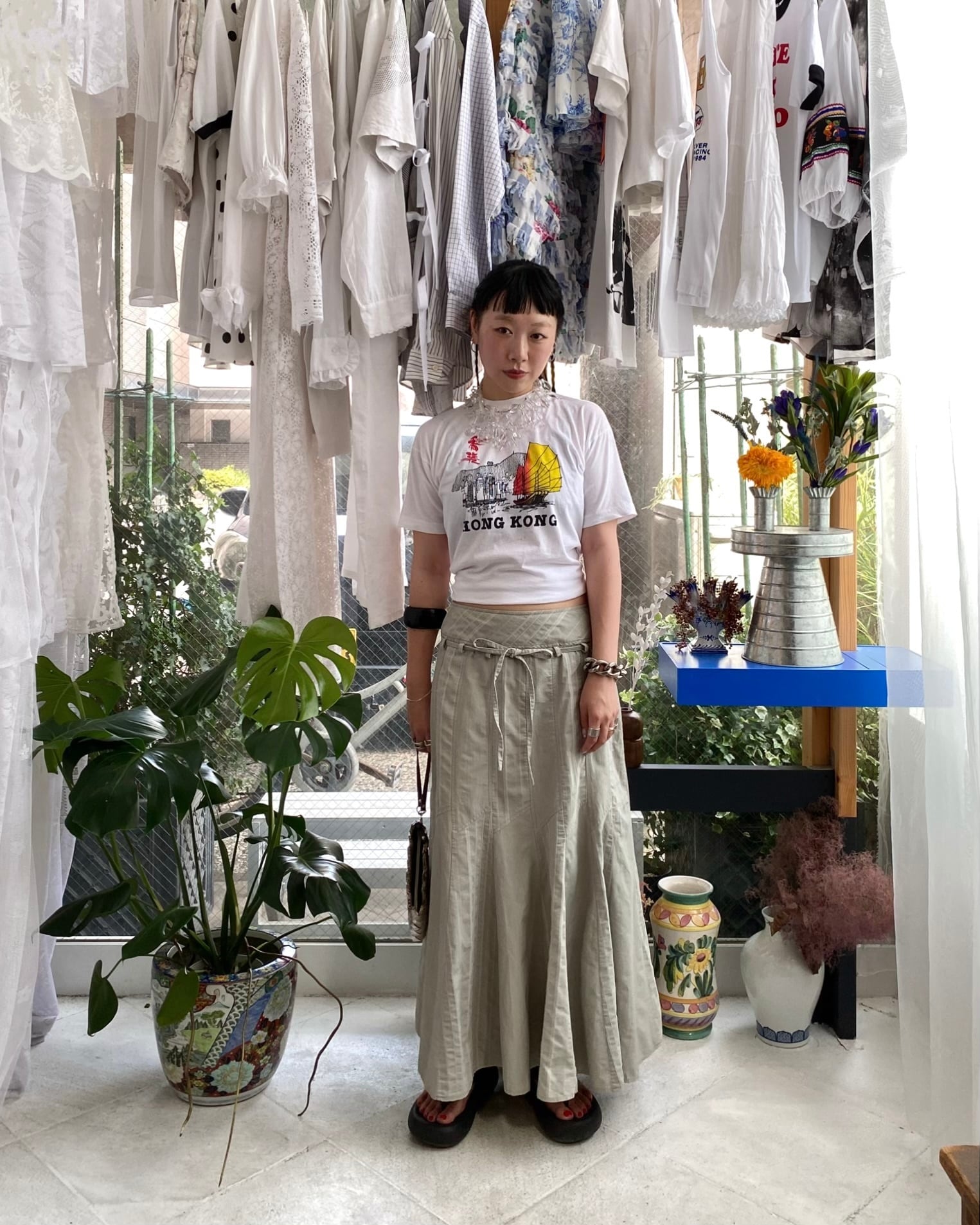 90sムードらしく、チビTeeにお腹出しで合わせるのが今の気分。