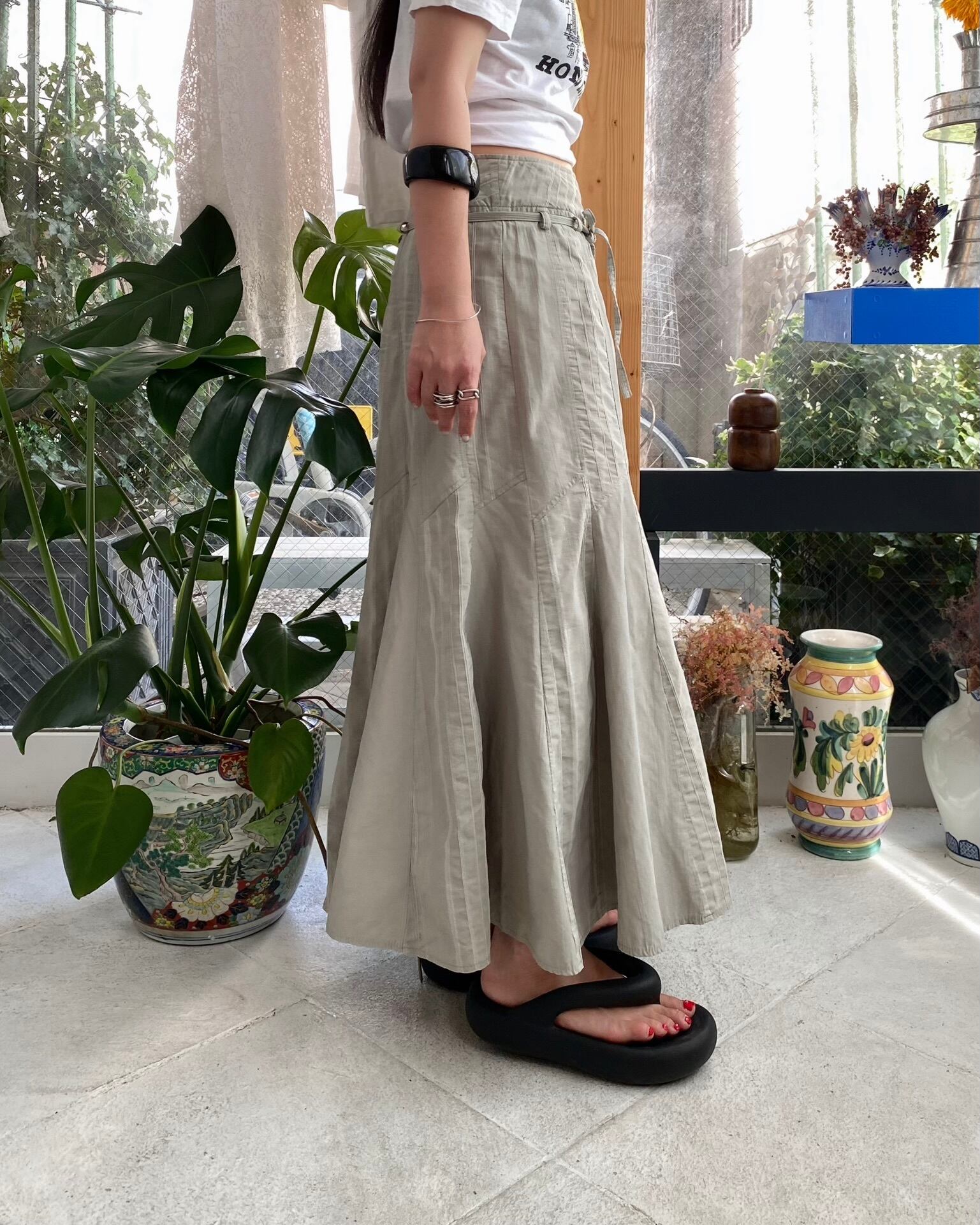 ストライプテキスタイルが良いニュアンスのマーメイドデザインスカート。