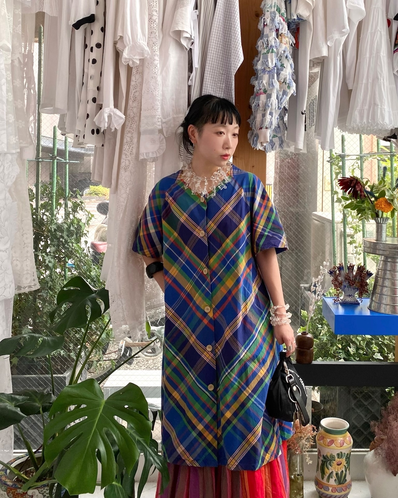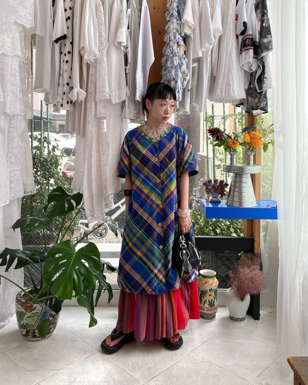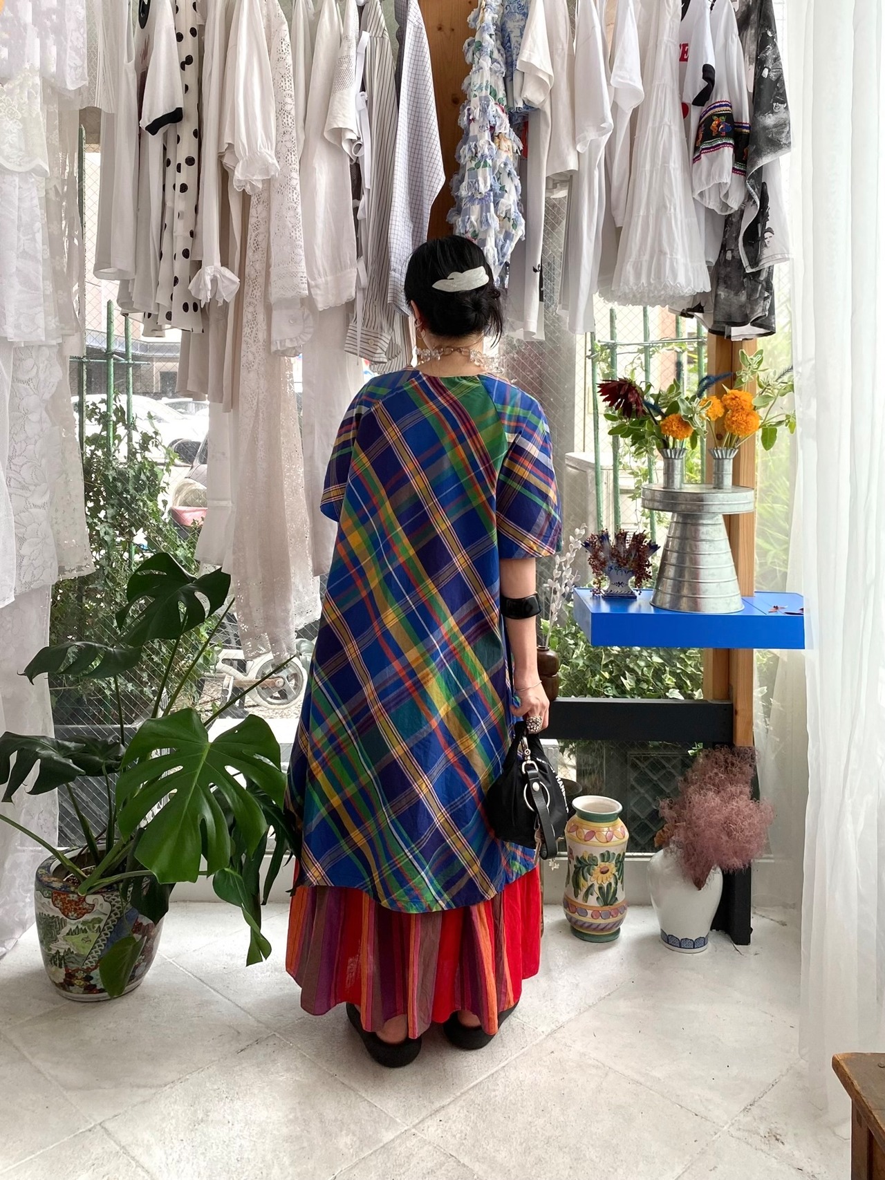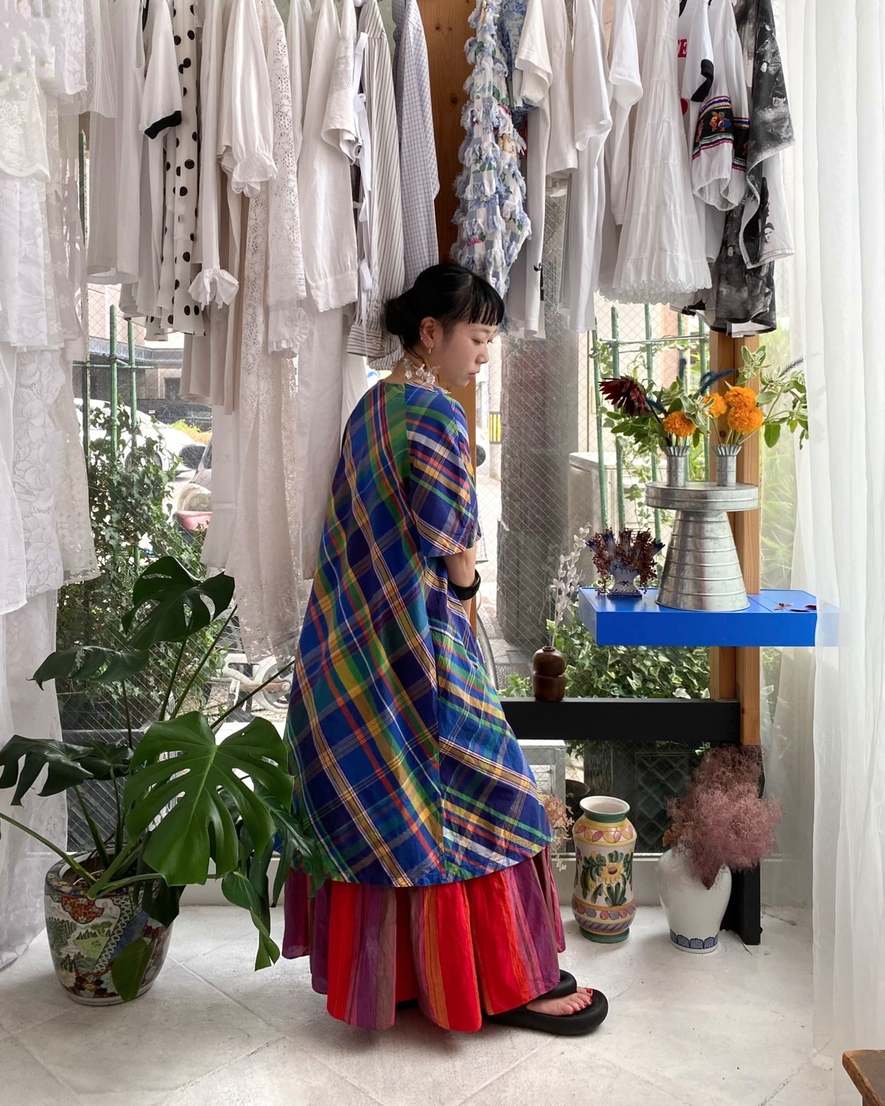 old cottonのテキスタイルを使用したチェック柄ワンピース。