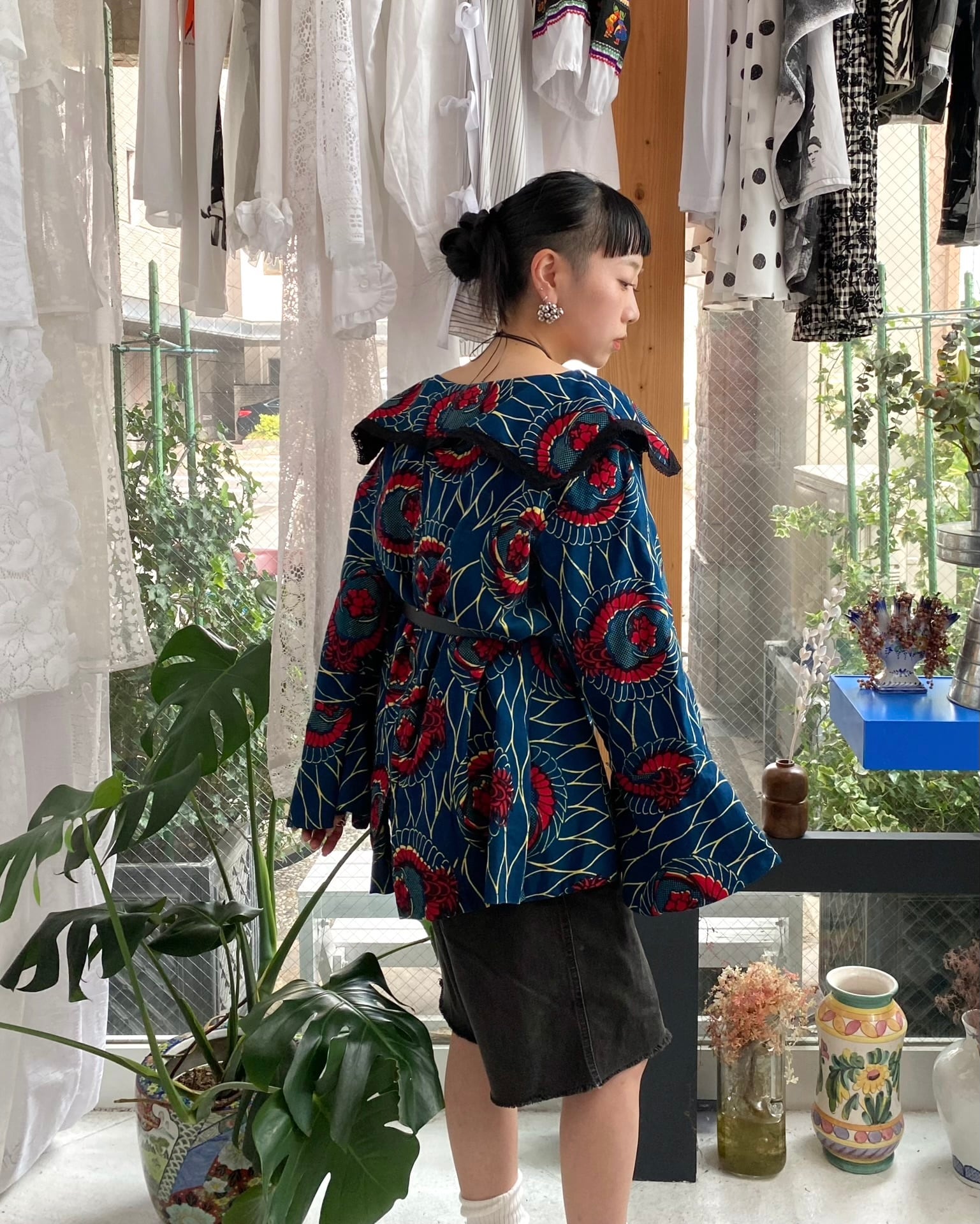 スクエアシルエットの襟とフレアスリーブの図形的なフォルムが個性豊かですね。