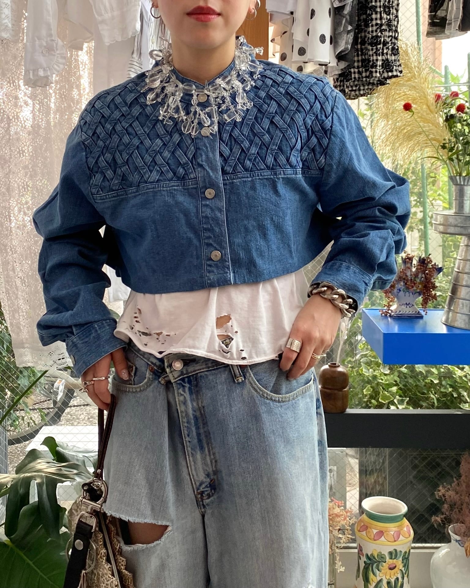 フロントの編み込みデザインがちょっと個性的で可愛いデニムシャツ。