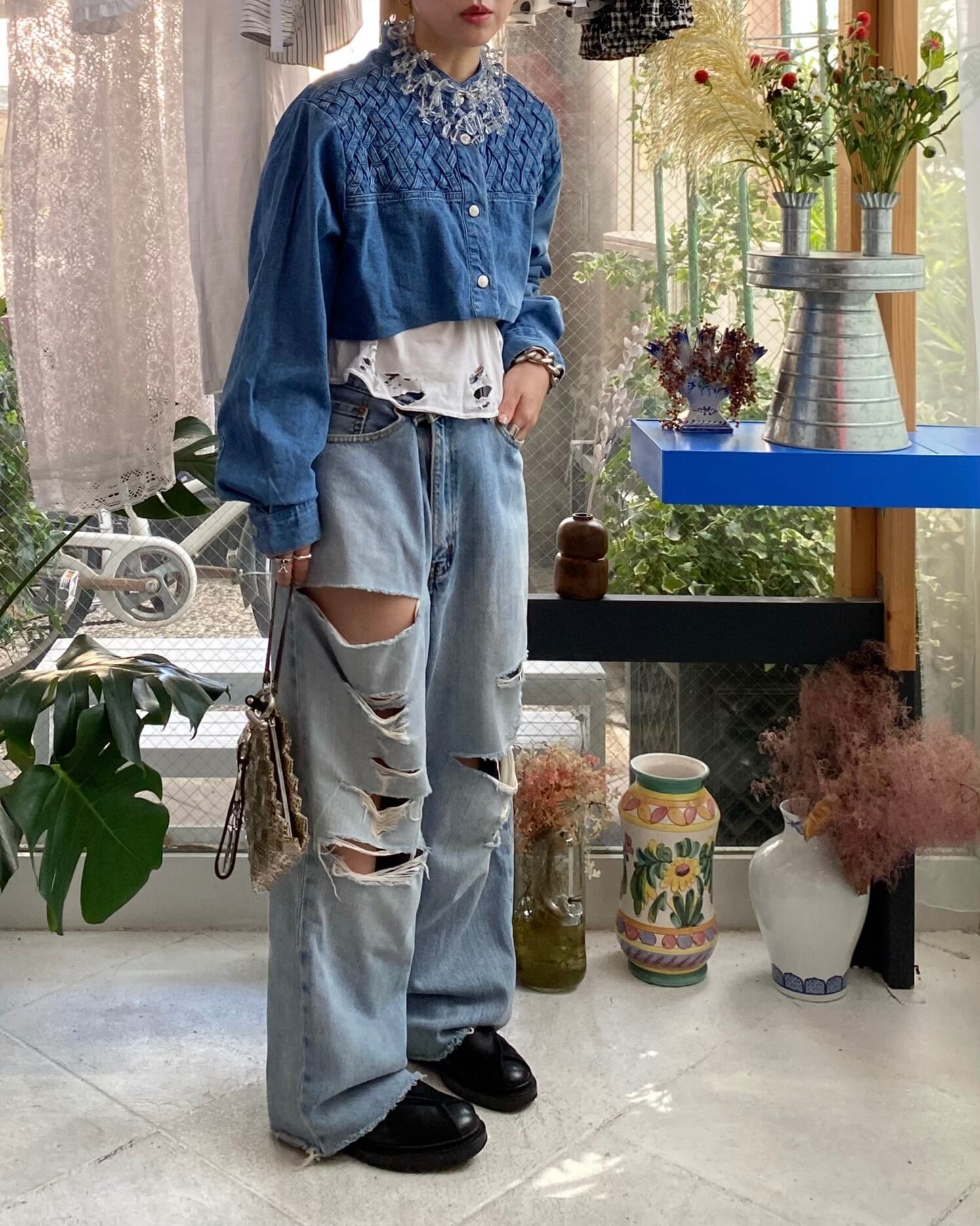 クロップド丈にリメイクしており、身幅が広くワイドなシルエットとゆとりあるスリーブのバランスが新鮮です。