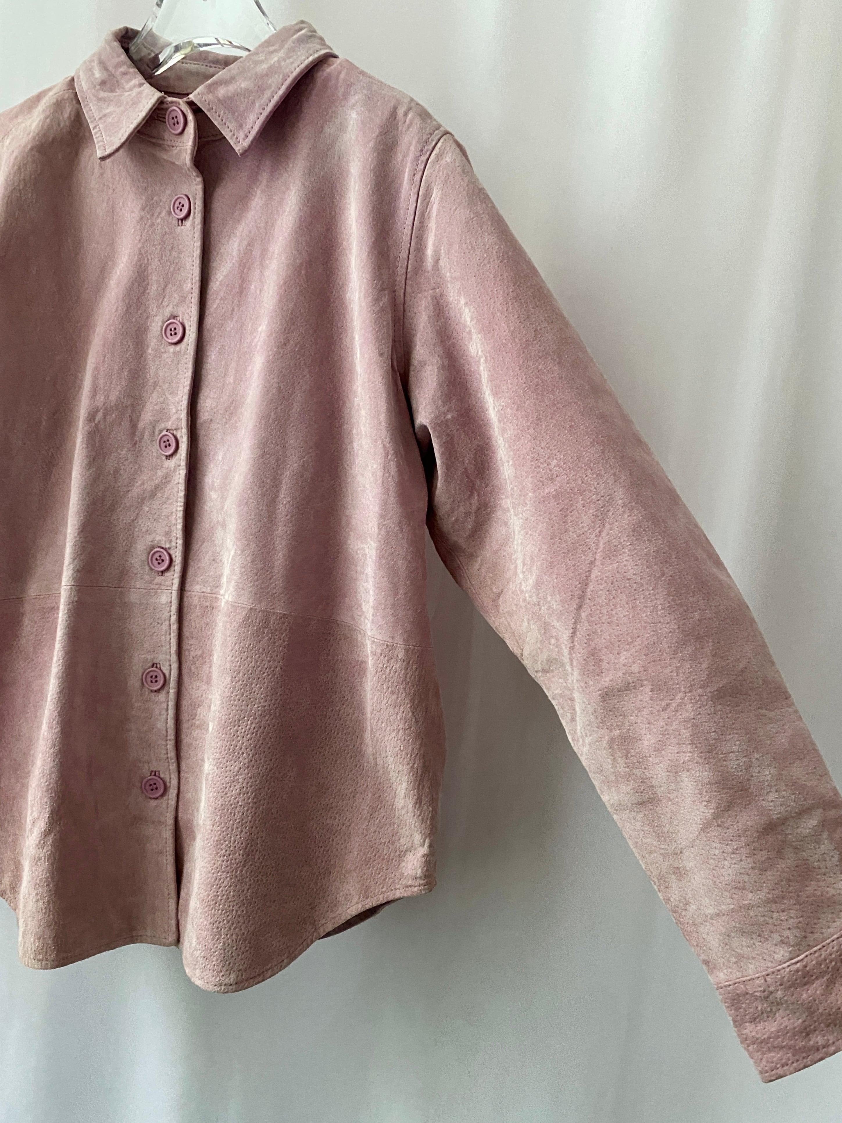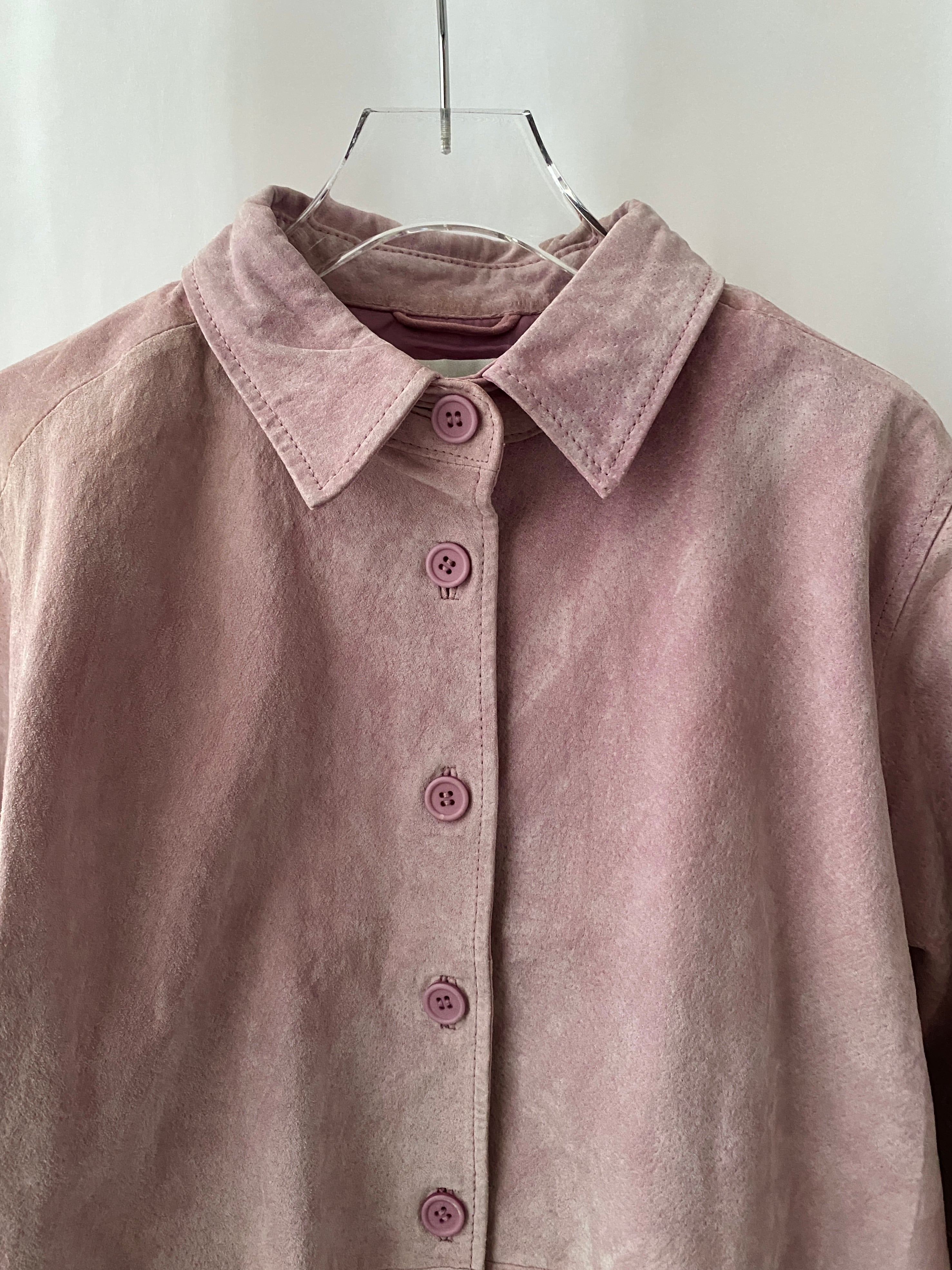 ピンクパープルカラーのリアルスエードシャツ、とびきり可愛い色みに心奪われるはず。
