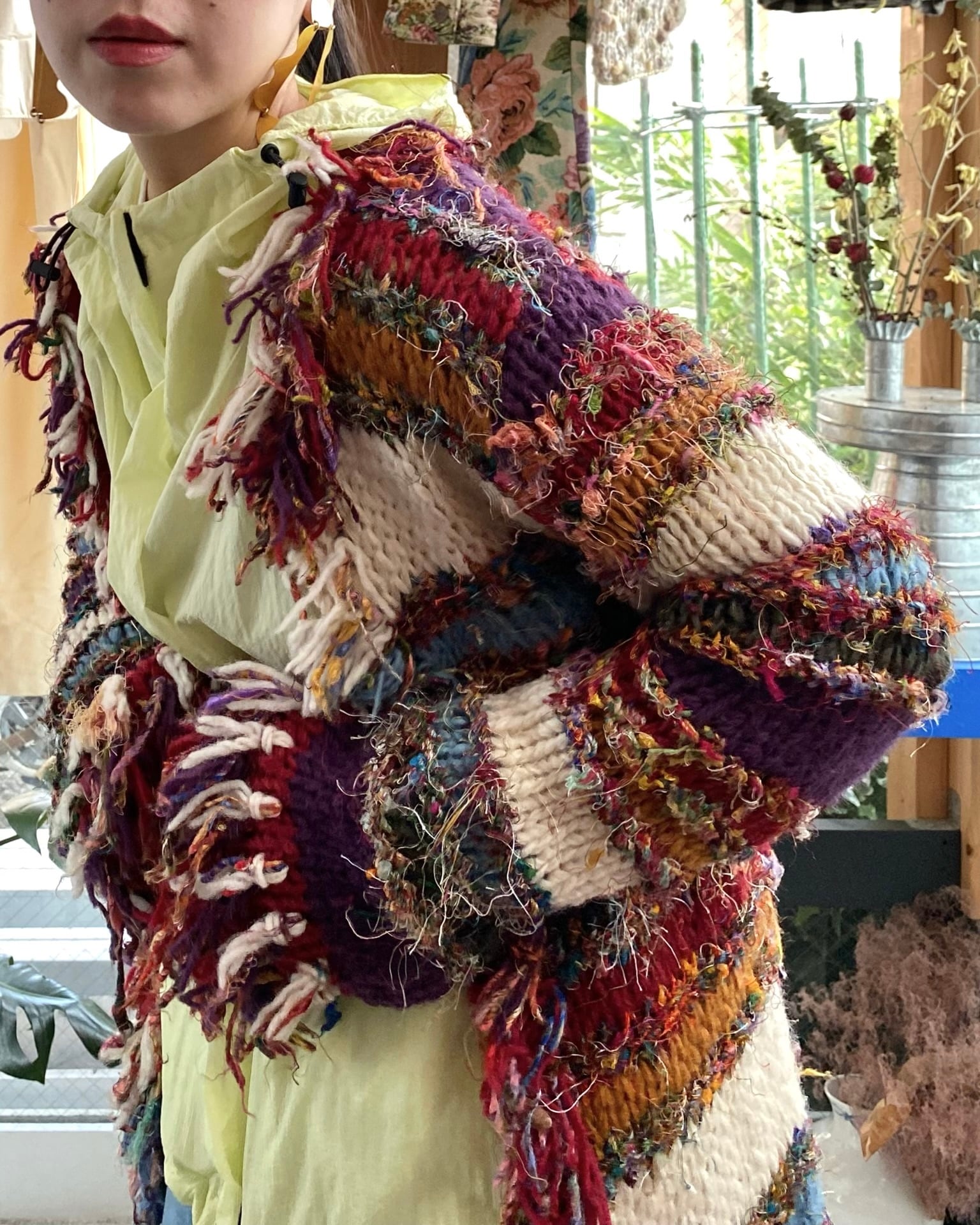 ウールの毛糸と発色良いシルクの糸をミックスして編まれており、マルチボーダーで多色使いのロングガウンなのでとってもインパクトがあります!