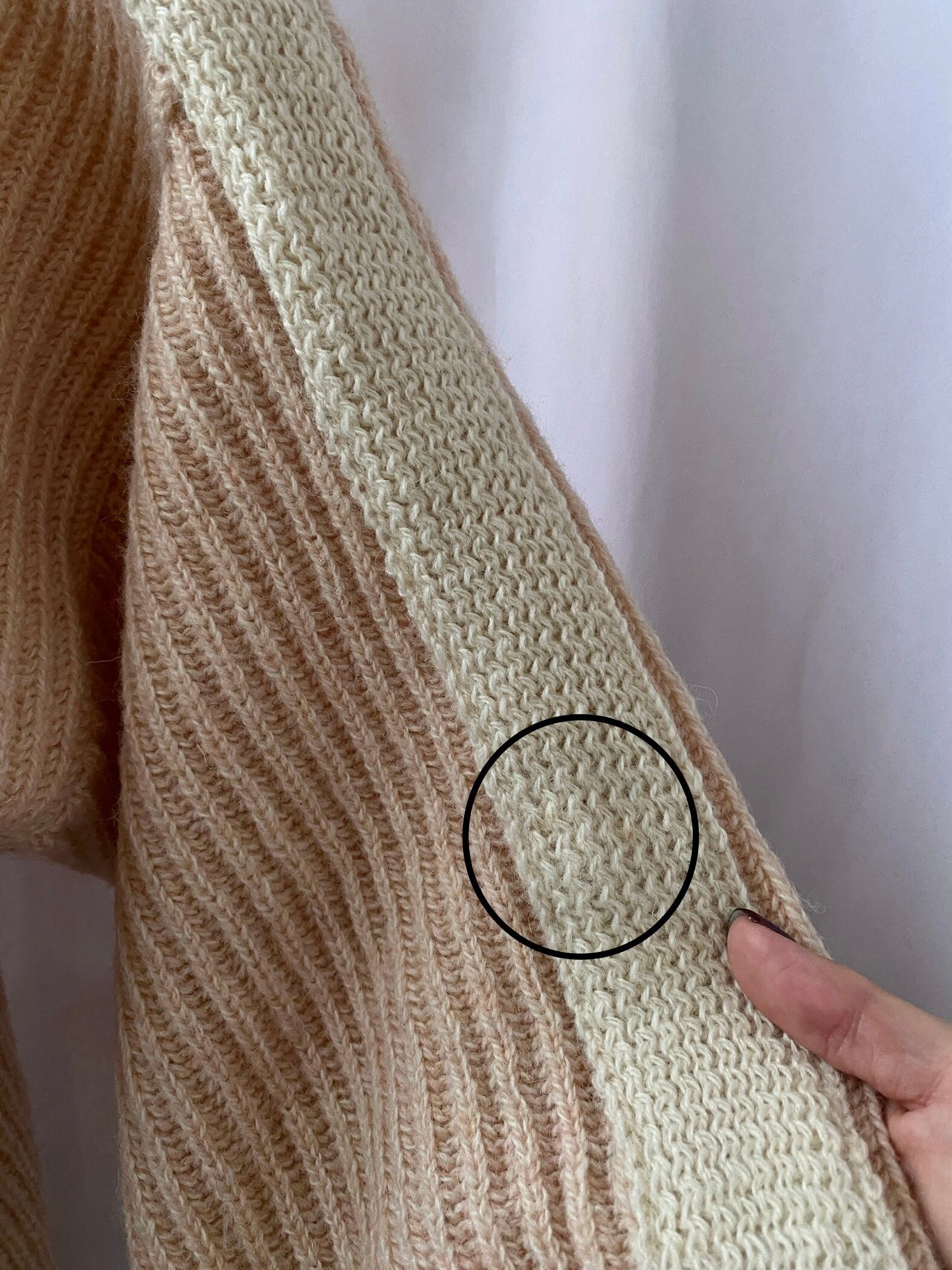 意外と膨張しないのはリブ状の編み模様と袖のラインのどちらもが縦を強調しているから、甘すぎない印象なのも好感度が高いです。