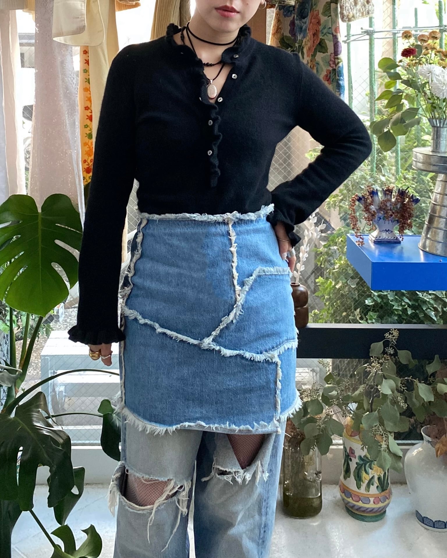 同じく胸元から首周りにもラッフルデザインが入っていて小ぶりながらも華やかな雰囲気に見せてくれていますね。ボタンを開けた時と閉めた時の印象がガラリと変わるのがポイントです。