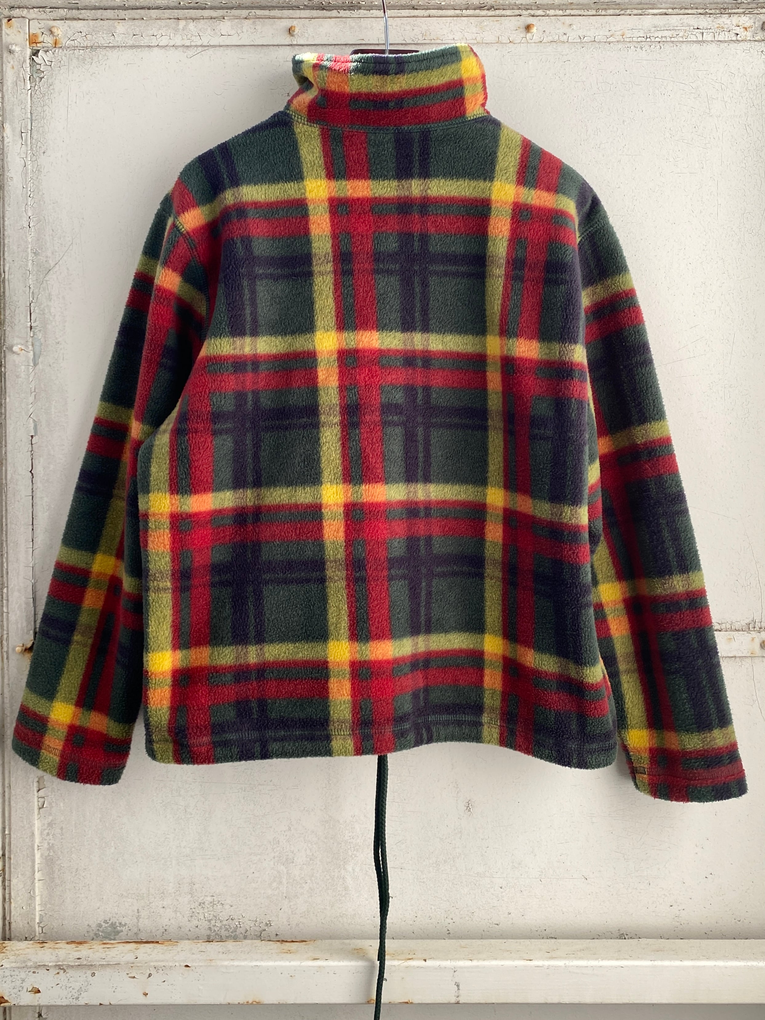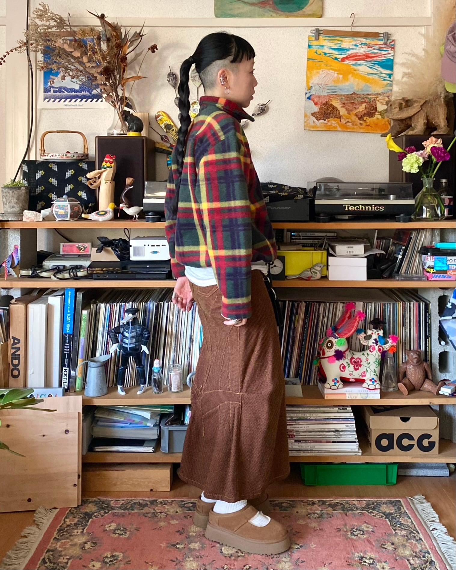 カーキベースにイエローと赤いラインが際立つ大ぶりなチェック柄、フリース素材のもこもこ感が加わるとより一層可愛さが増しますね。