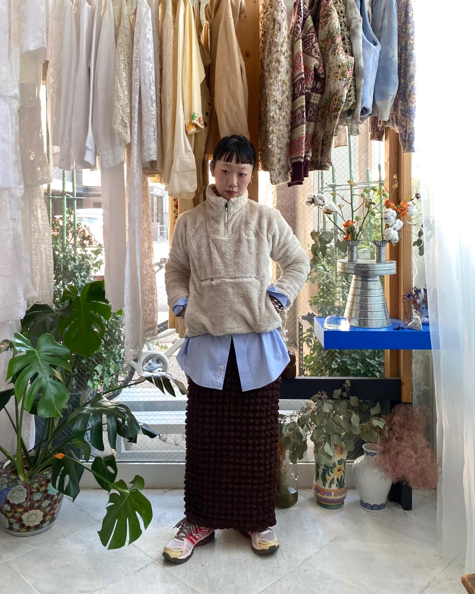 上からアウターも着れるくらいのボリューム感で色み的にも合わせやすいかと。