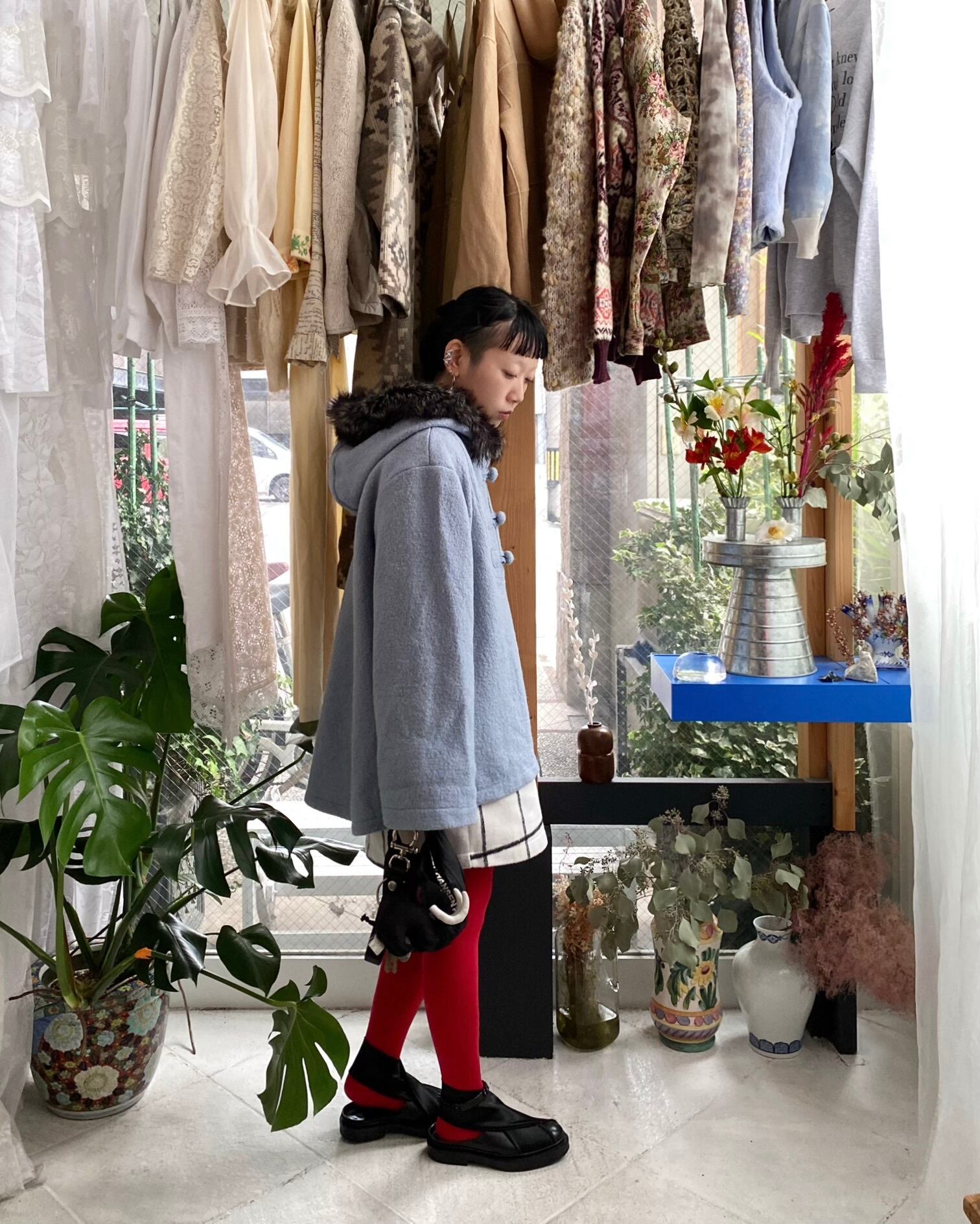 大きなフードとフロントのボタンのディテールは可愛い雰囲気で特にフード周りのファーが印象的、