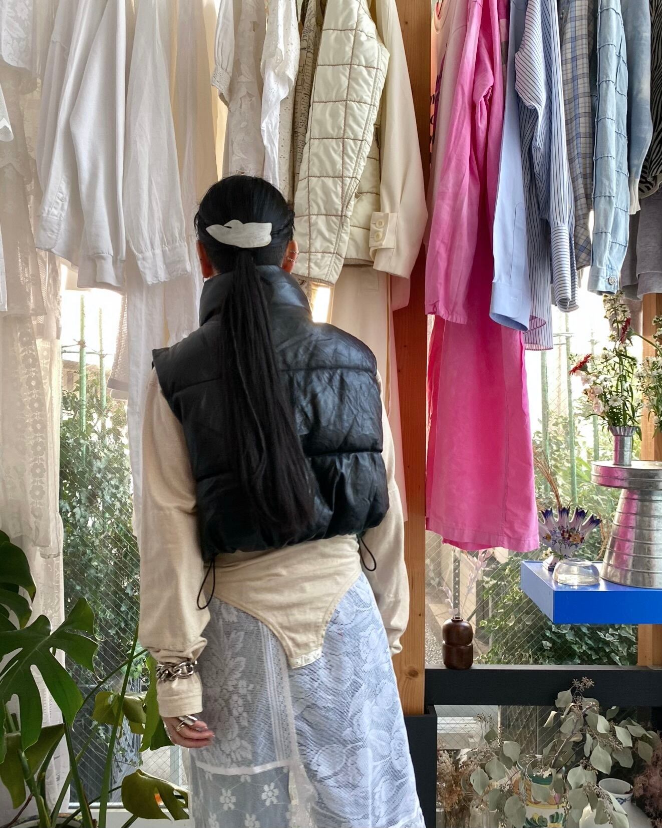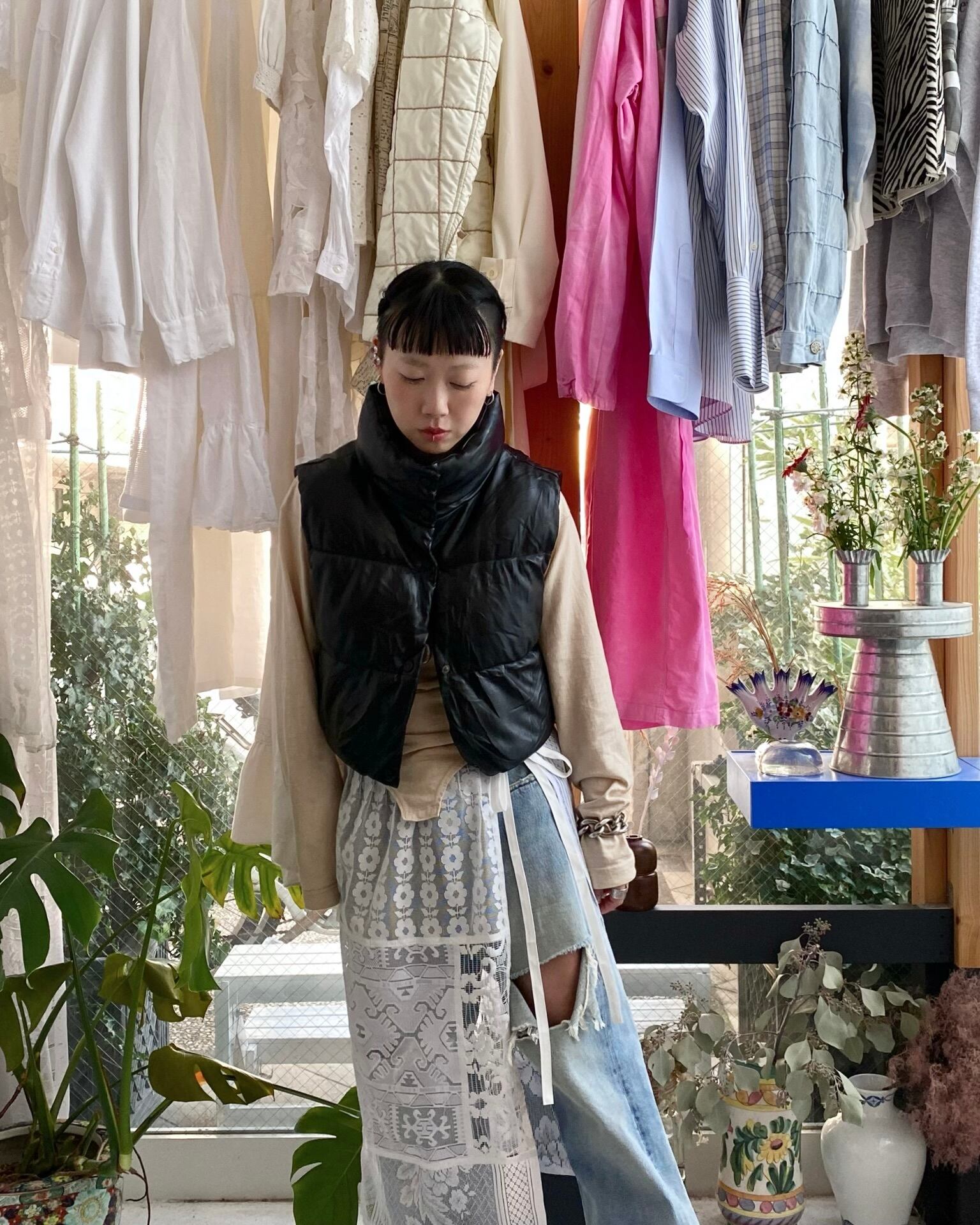 バランスの取りやすいクロップド丈、アームが広いのでウールジャケットなどライトアウターの上に重ねて楽しむ事も出来ると思います。