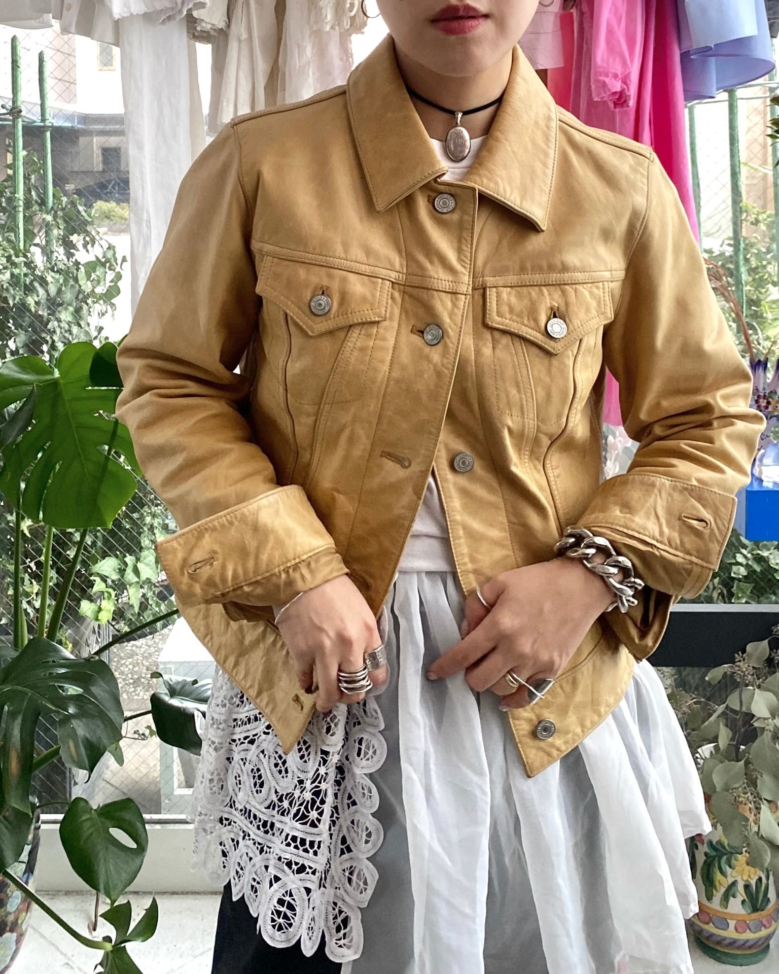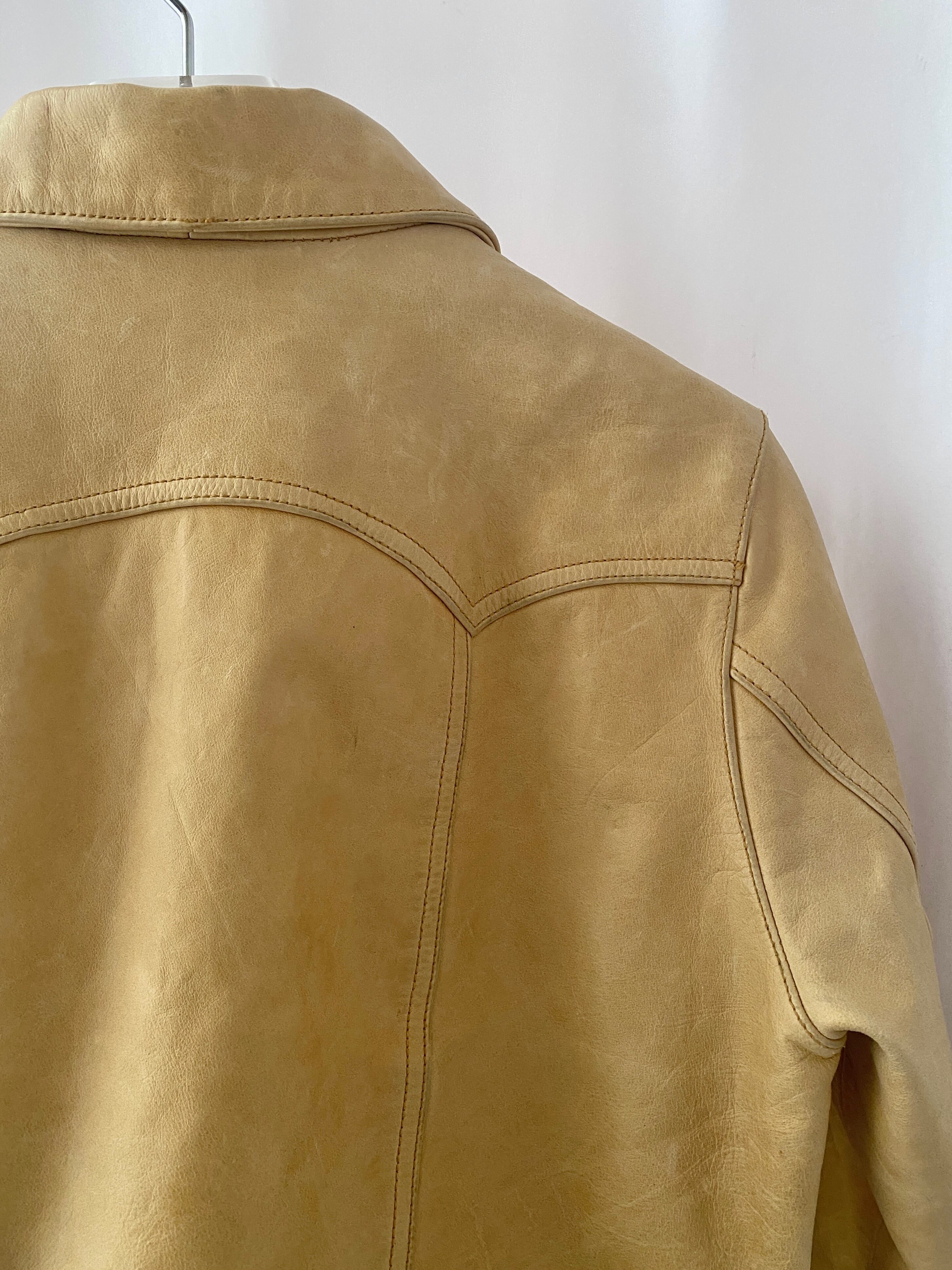 デニムジャケットのデザインをそのまま持ってきてレザーで製作したもので、