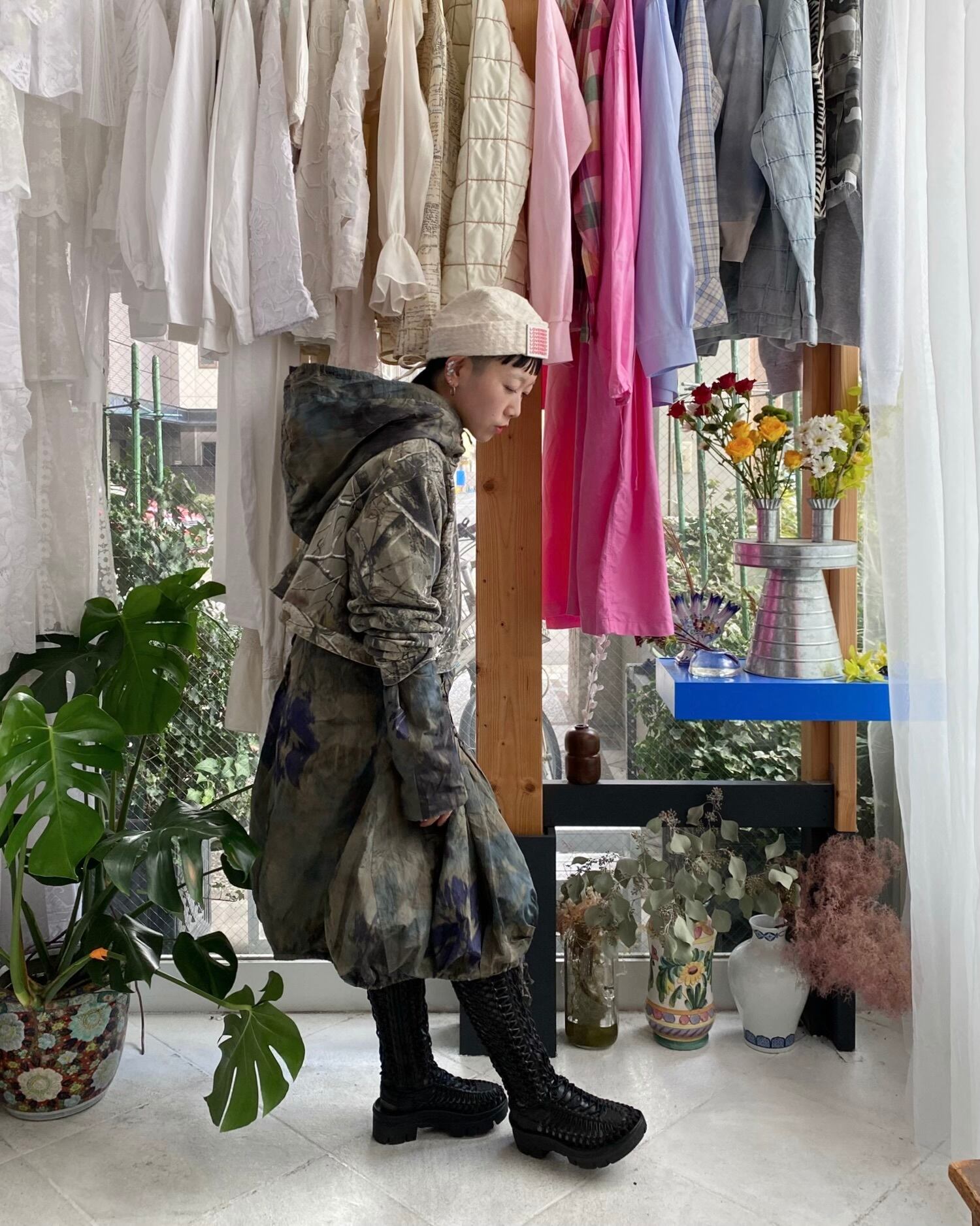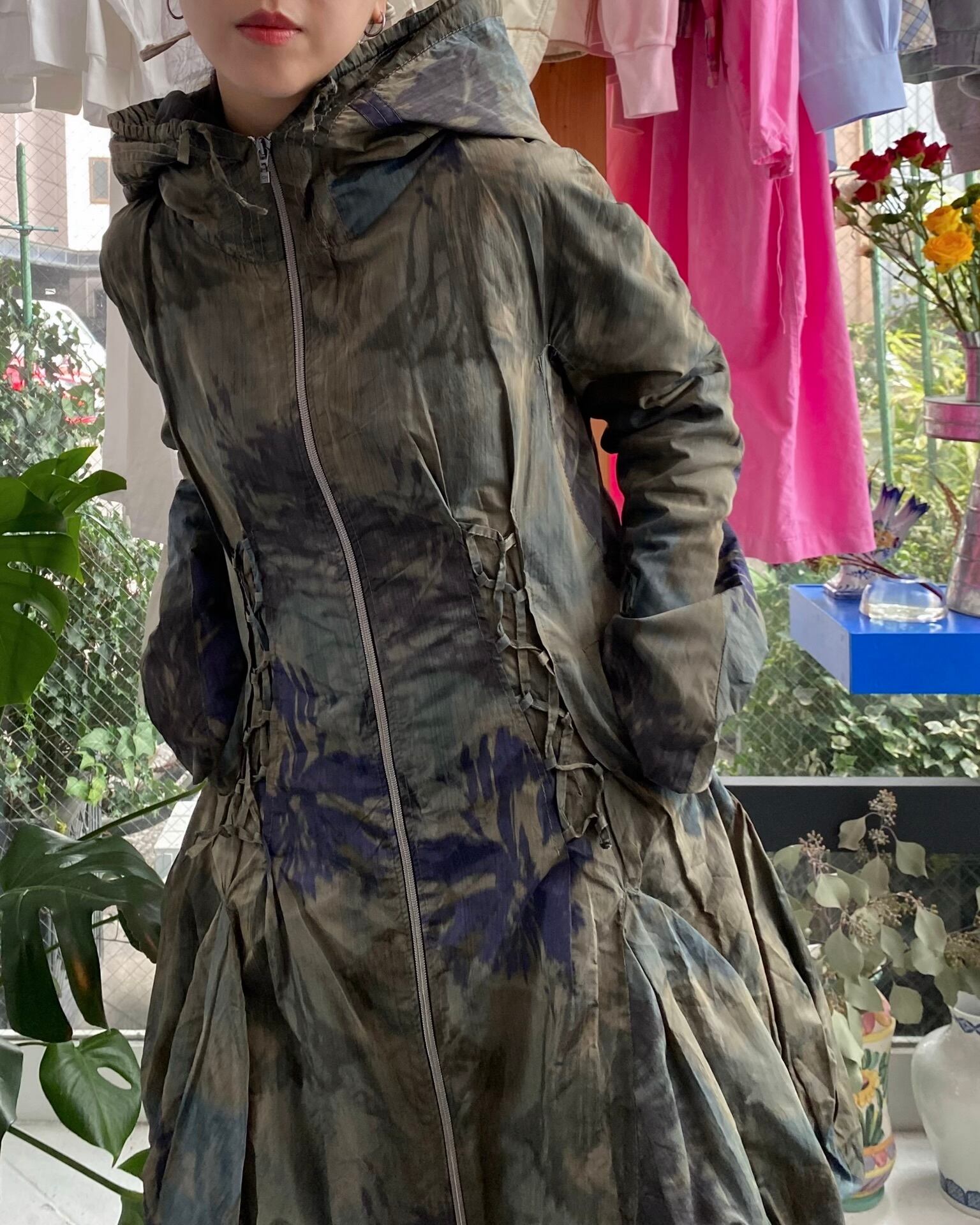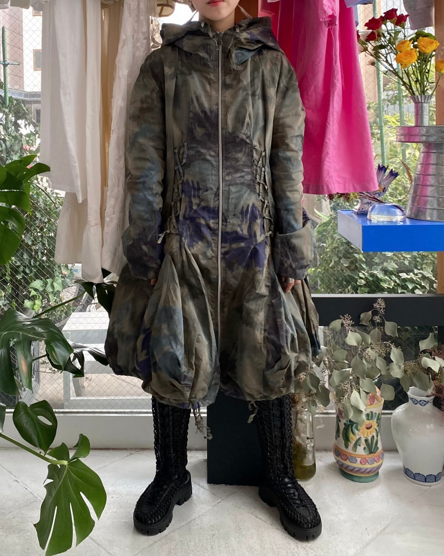 タイダイのムラ染め風のプリント生地はやや光沢感のあるスポーティーなテキスタイルで、ミリタリーライクなクールな雰囲気がかっこいいですね。