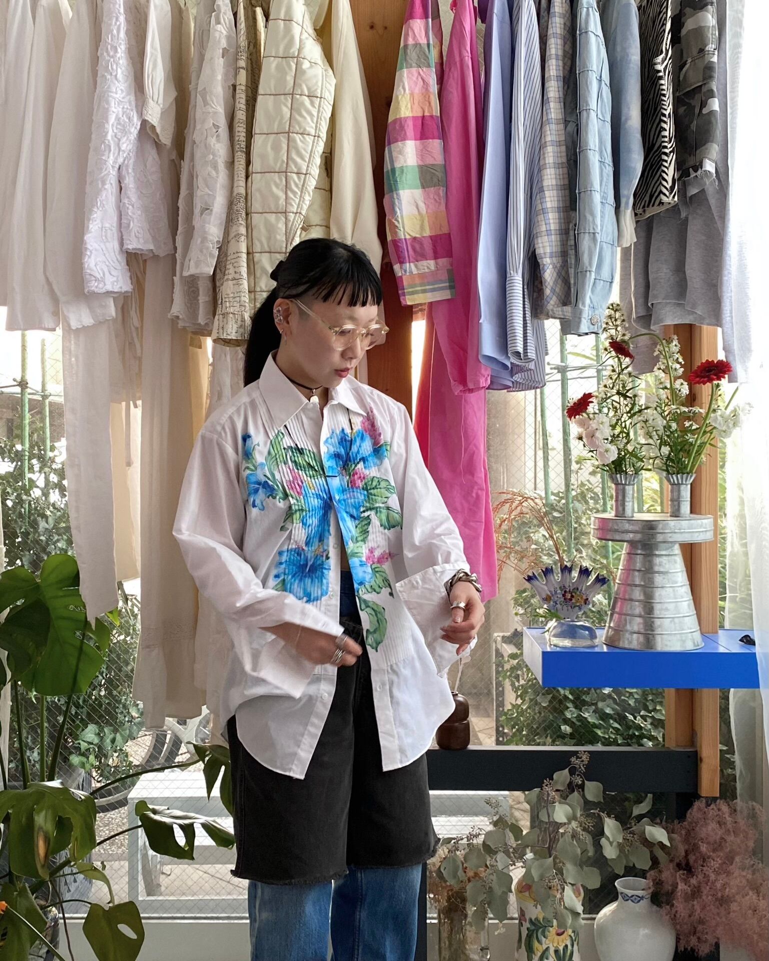 メンズのドレスシャツのタックデザイン部分全体に跨ぐ様にフラワーペイントが施された一着。