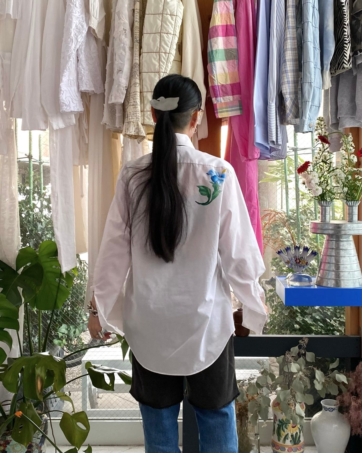 後ろ見頃、右肩のワンポイントも効いていて一枚でサラッと着たくなるこれからの季節におすすめです。