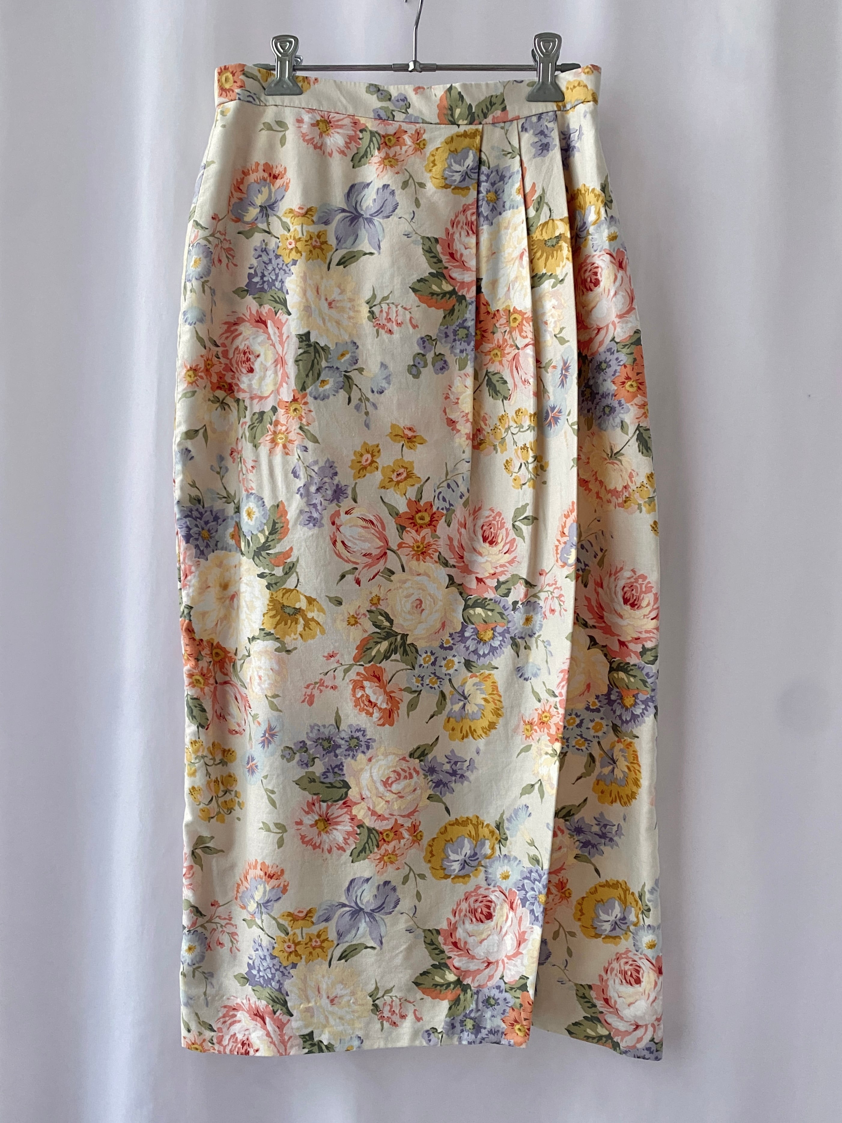 ちょっとレトロで淡いカラーリングのテキスタイルが目を引くロングスカートです。