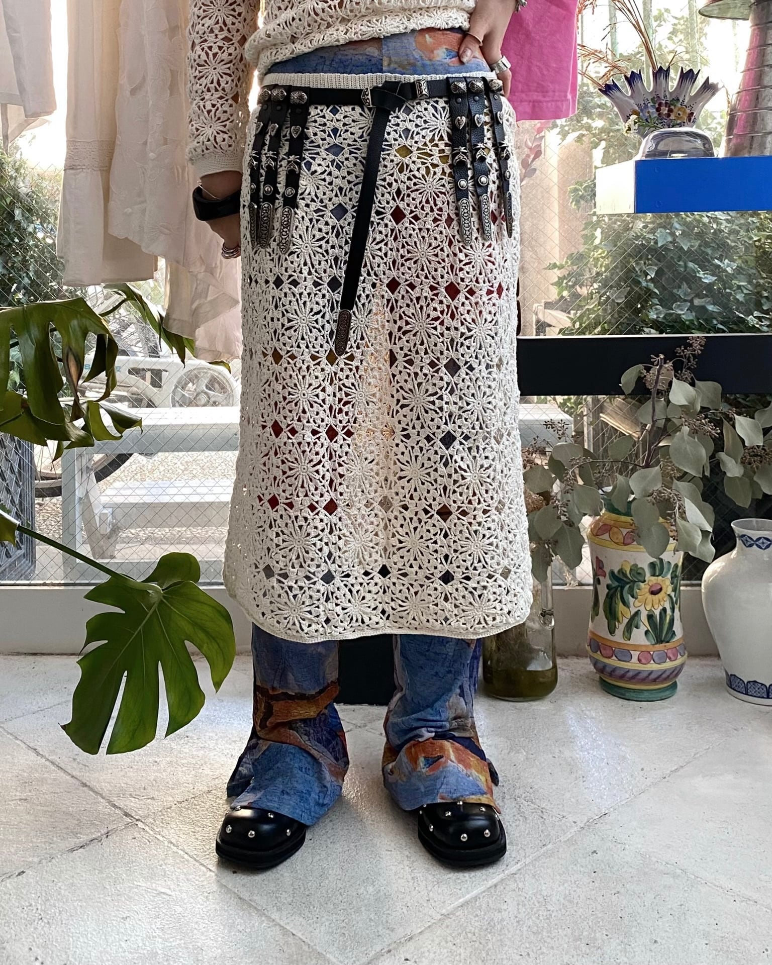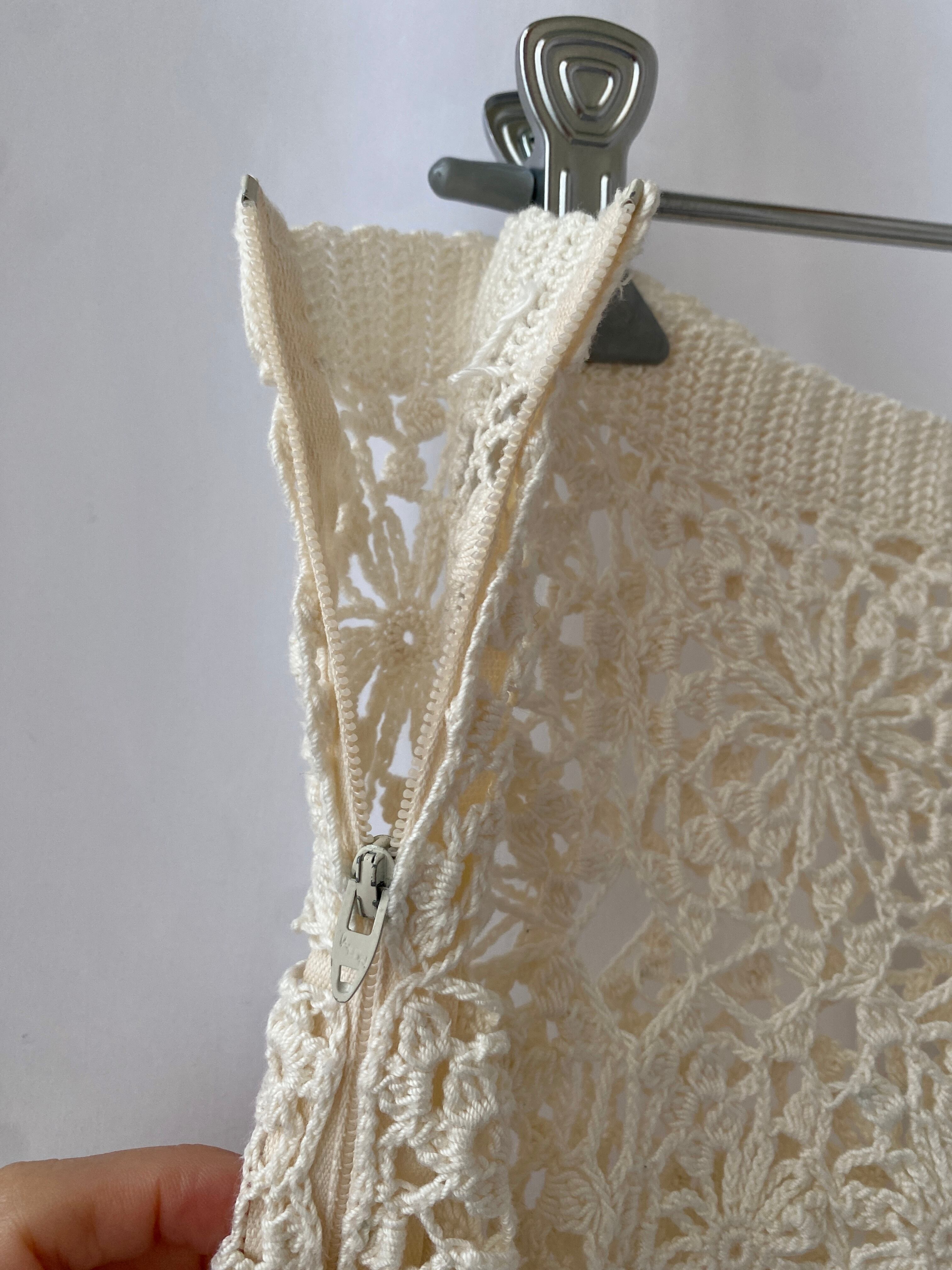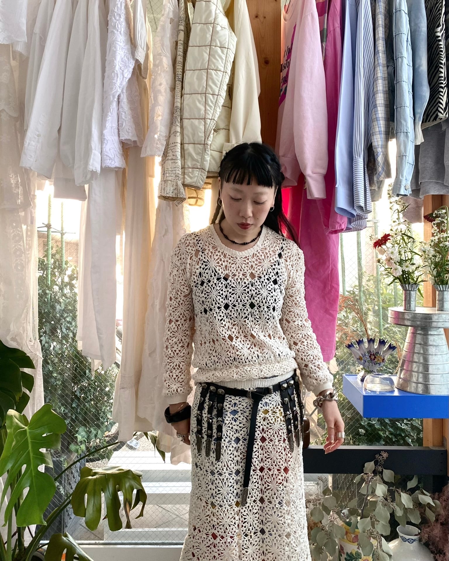 ハンドメイドにて製作されたコットンニットのクロシェセットアップ。