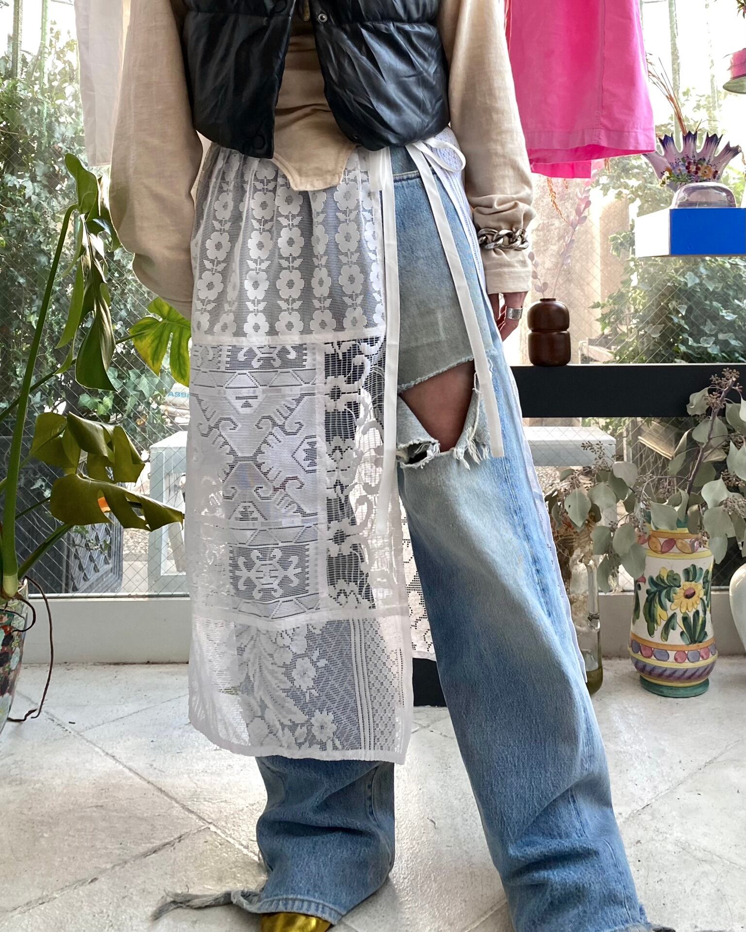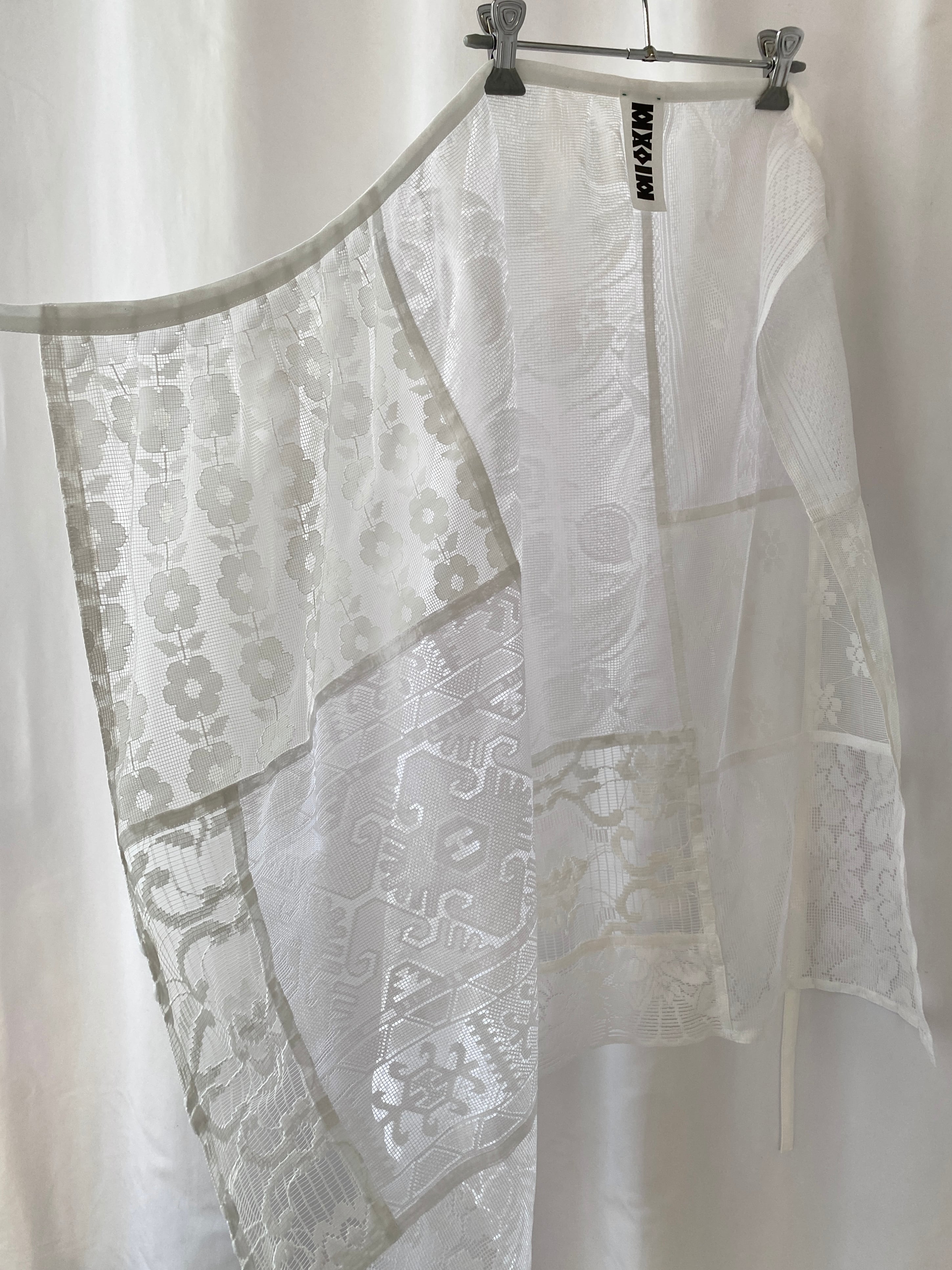 古いカーテンのレース生地を多数使用して製作した一点ものの巻きスカートです。