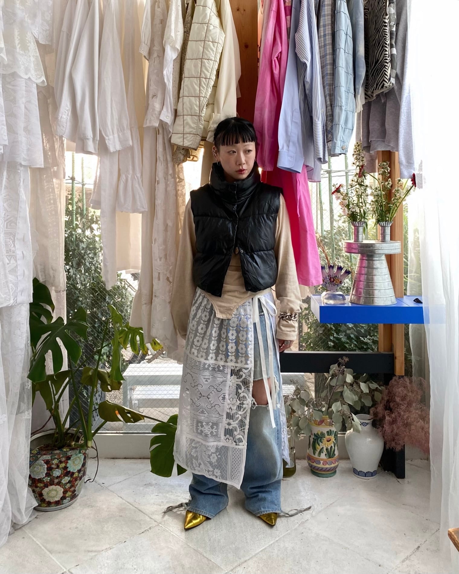 基本的にレイヤードでの着用を想定してウエスト位置はヒップハングに設定しています。