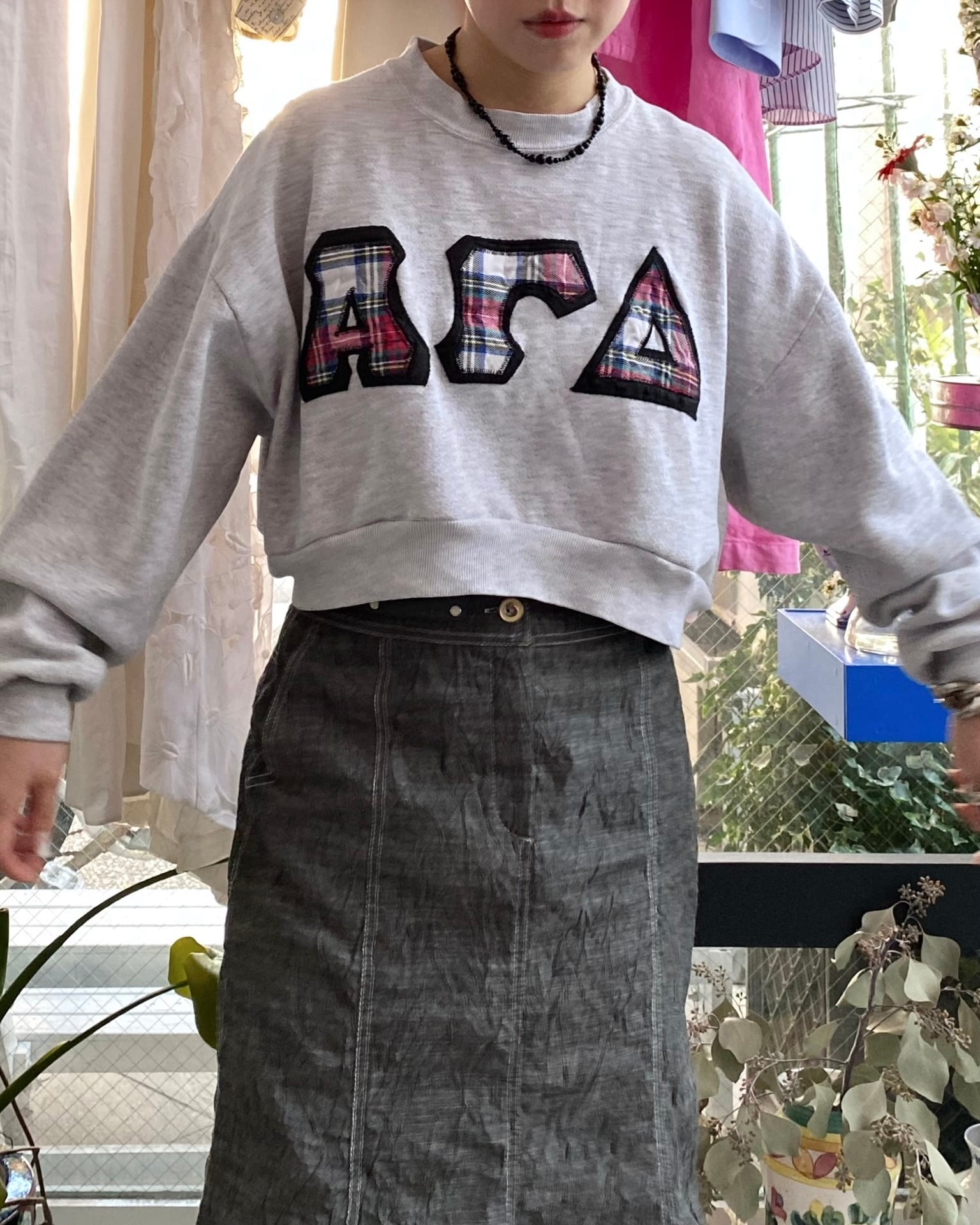 ギリシャ文字のロゴパッチがインパクトあるクロップドスエット。