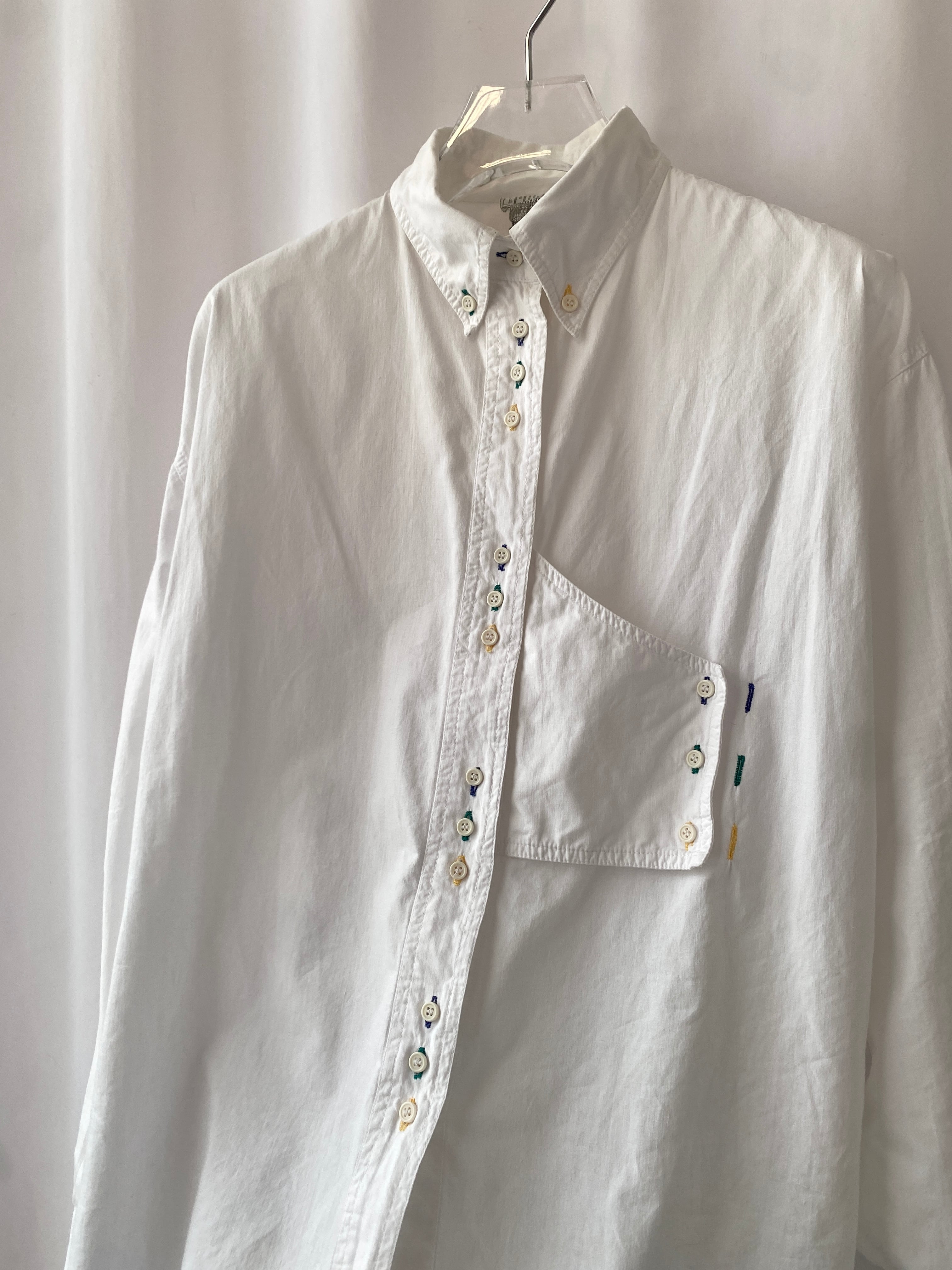 遊び心たっぷりのボタン位置とカラフルなボタンホールステッチが個性的なコットンシャツ。