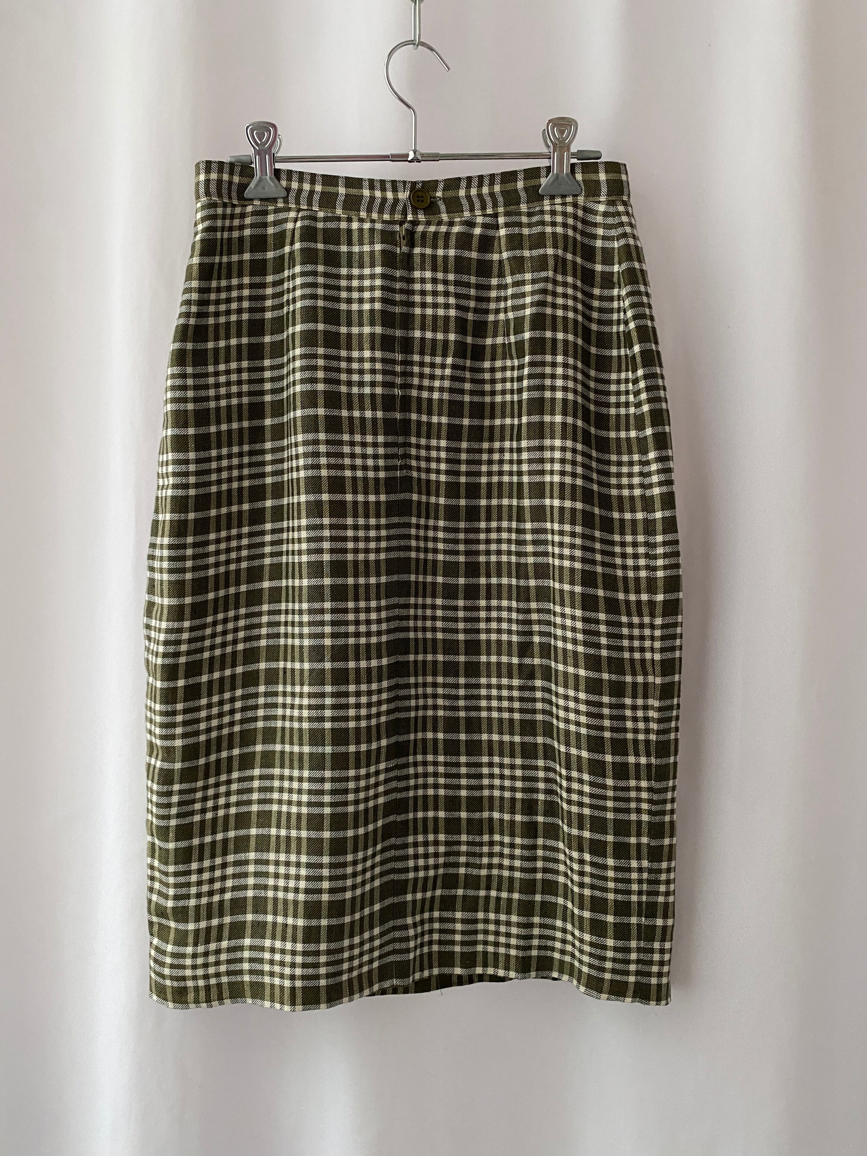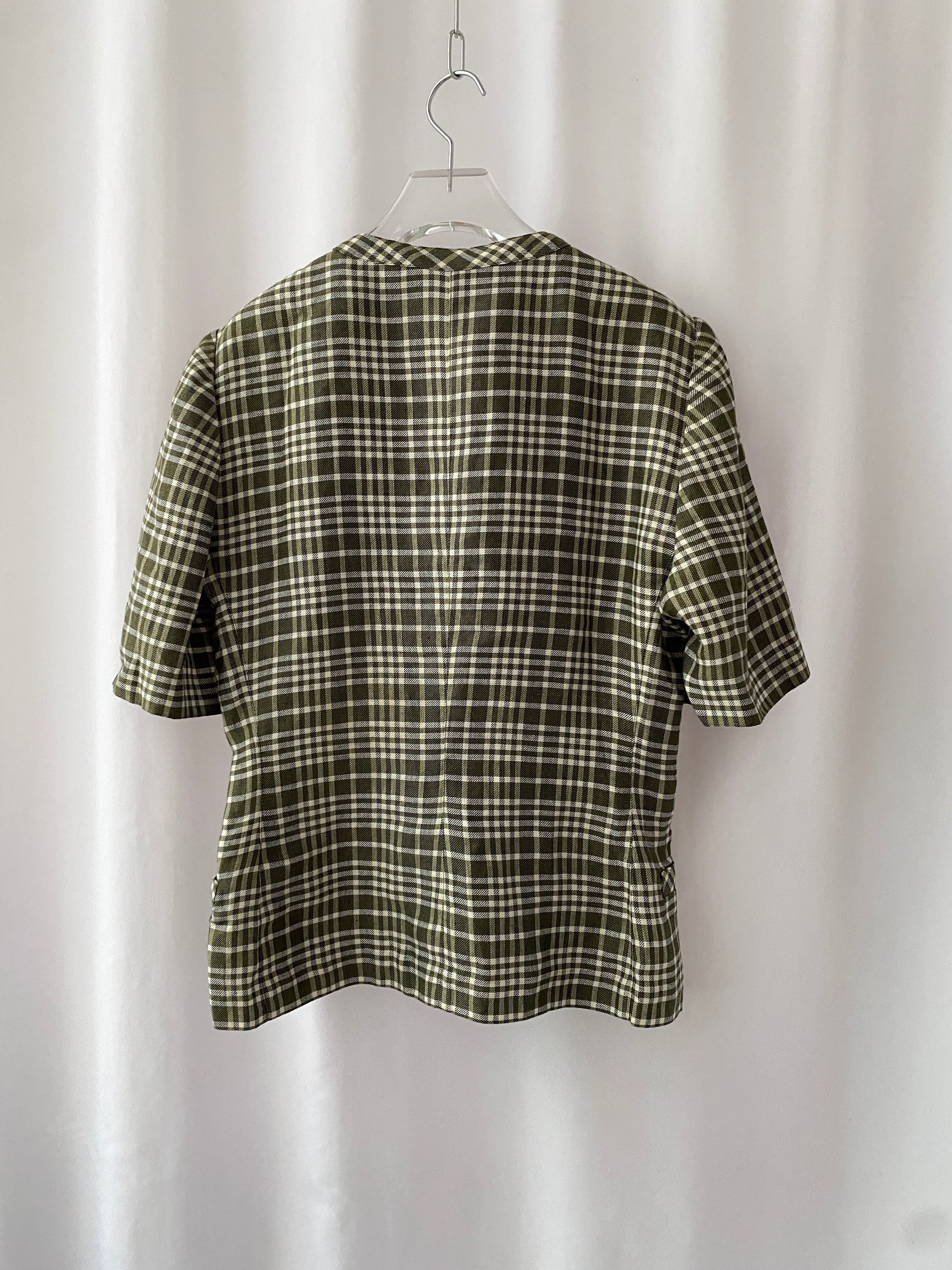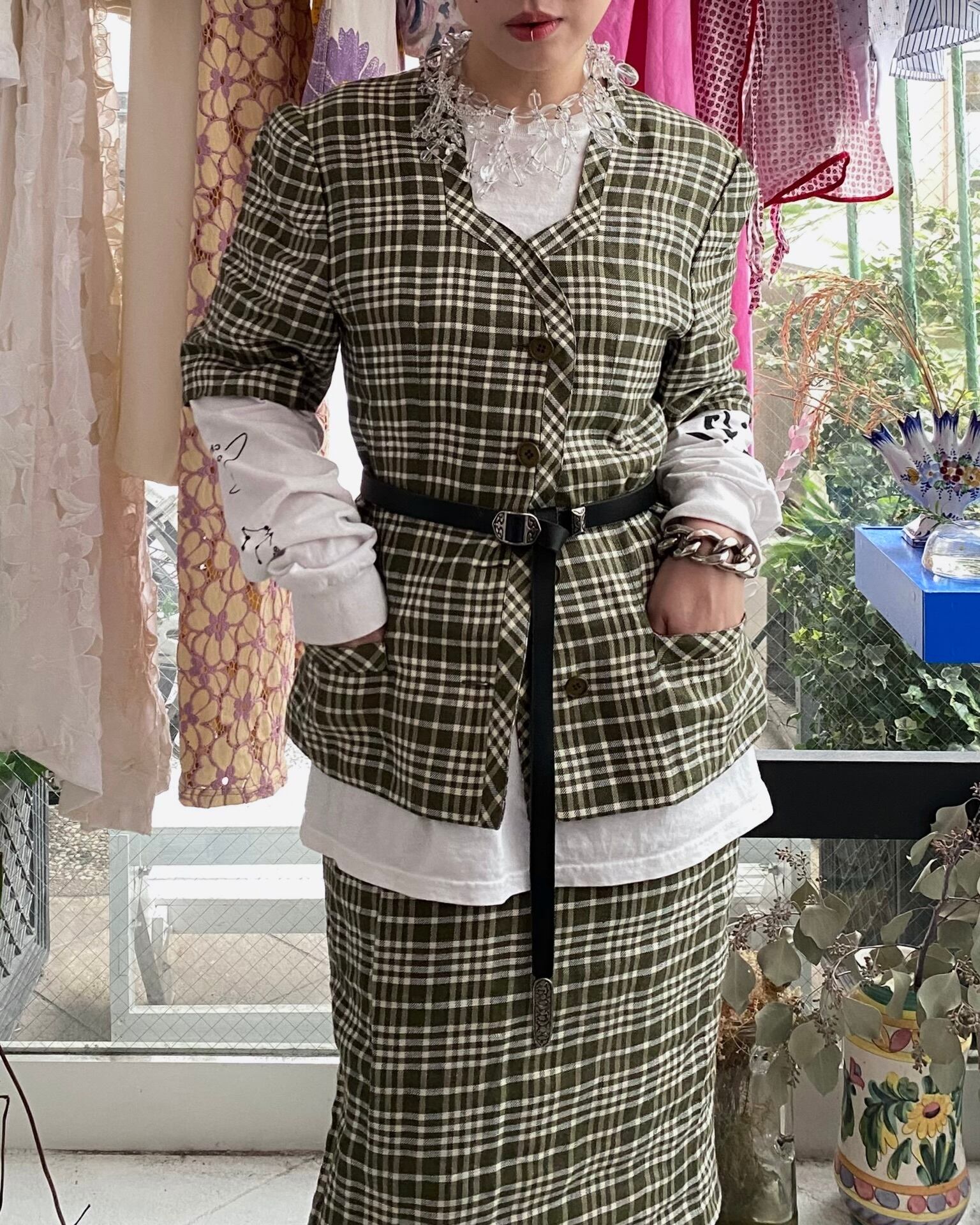 落ち着いたカーキカラーをベースとしたチェックなので上下セットでの着用も派手すぎずに着られるはず。