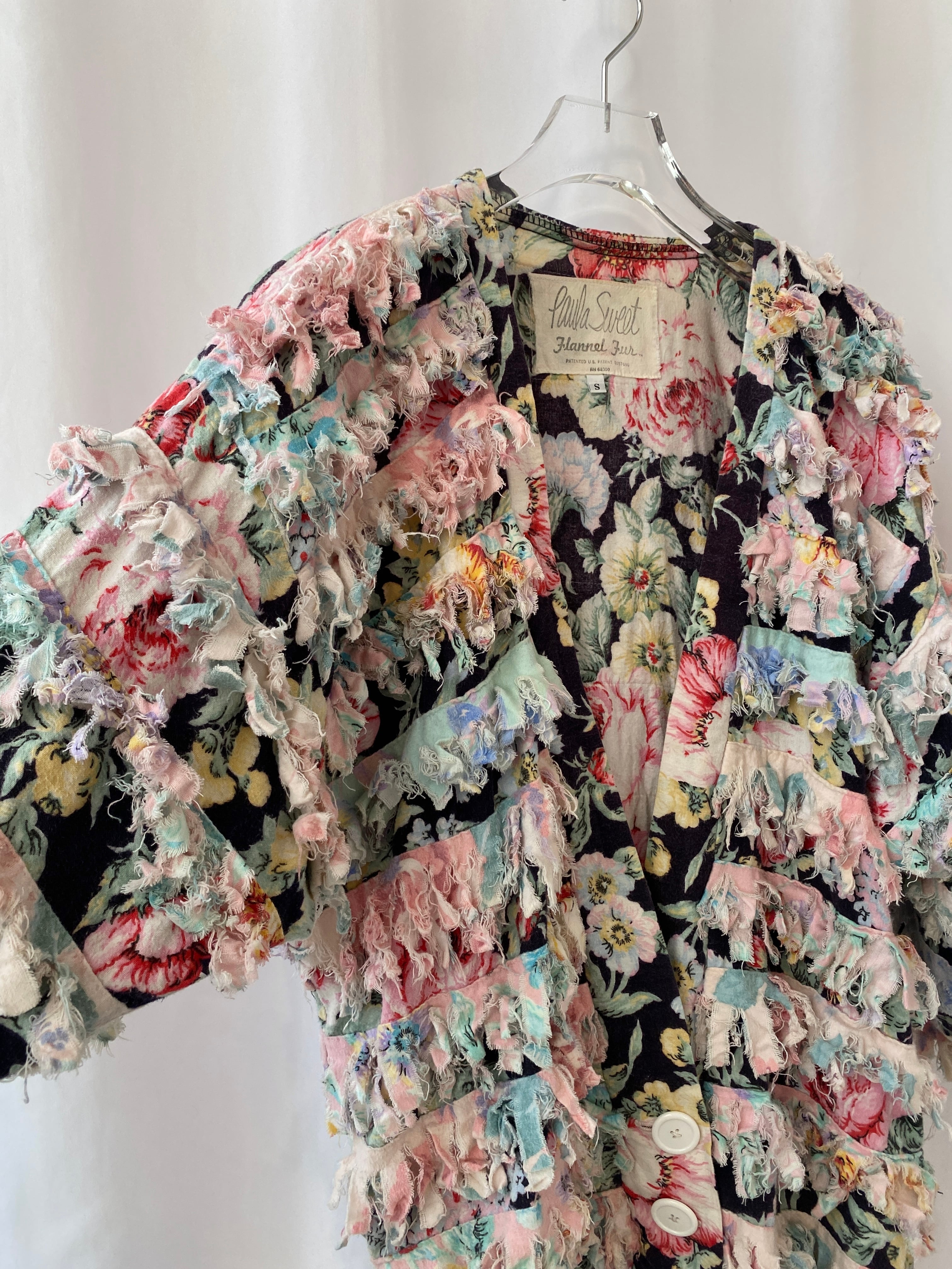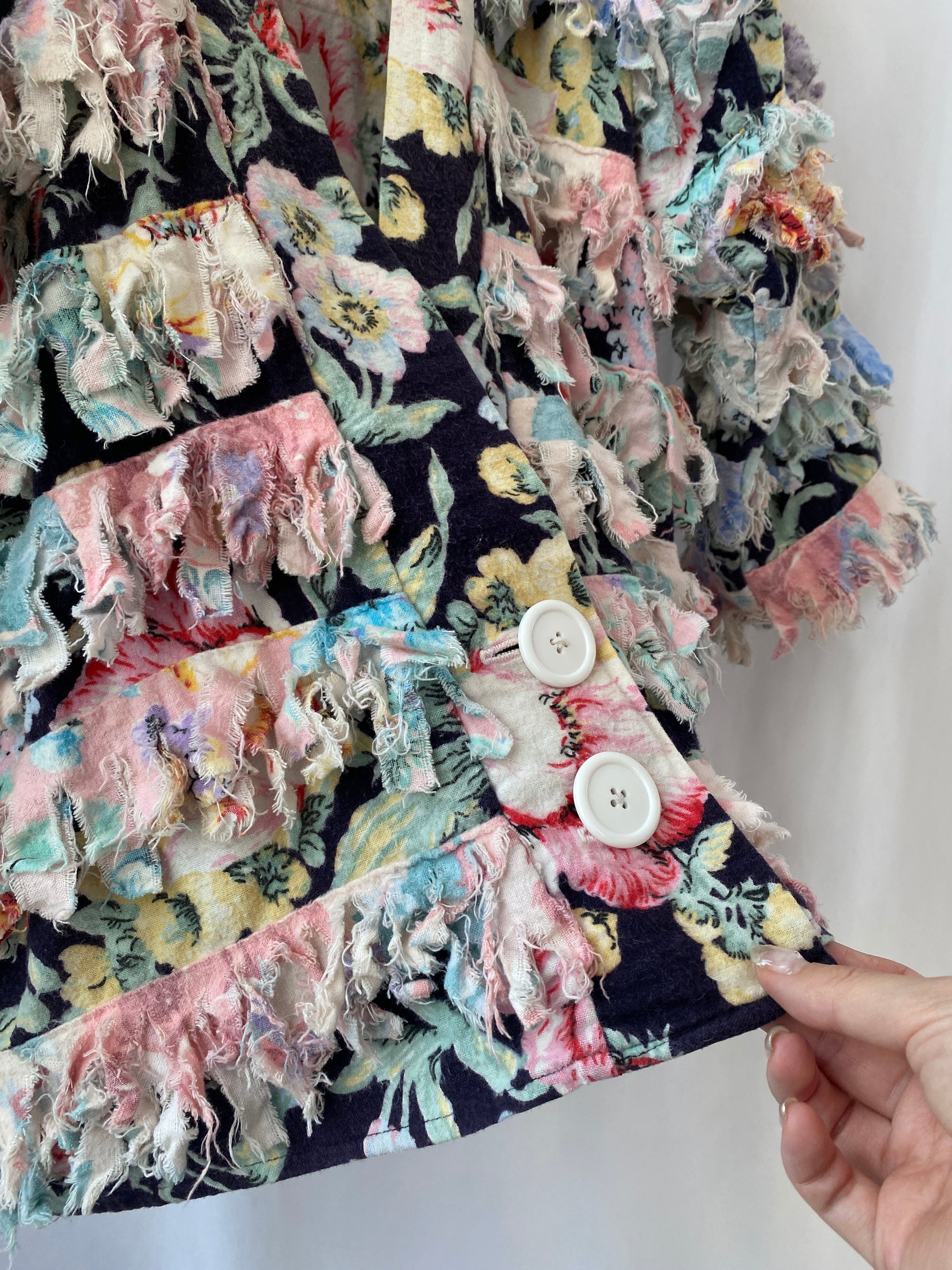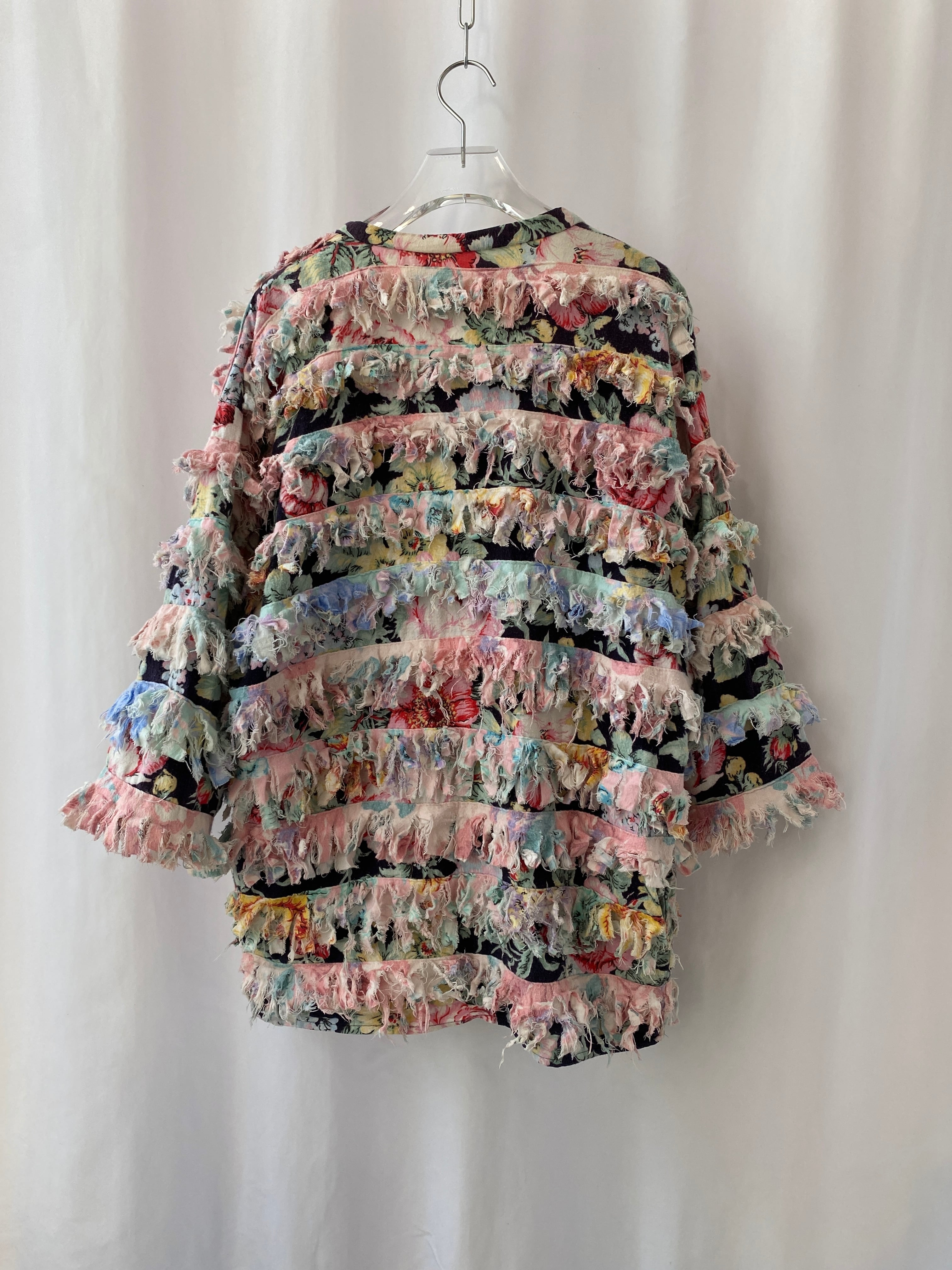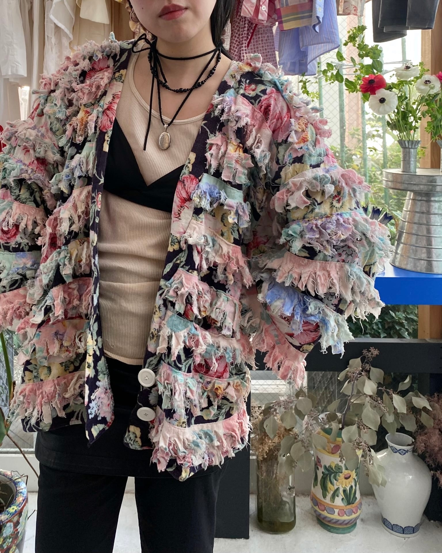ブラックの花柄プリントベースにペールトーンのフリンジがミックスされた春らしくてパワフルなフリンジジャケット。