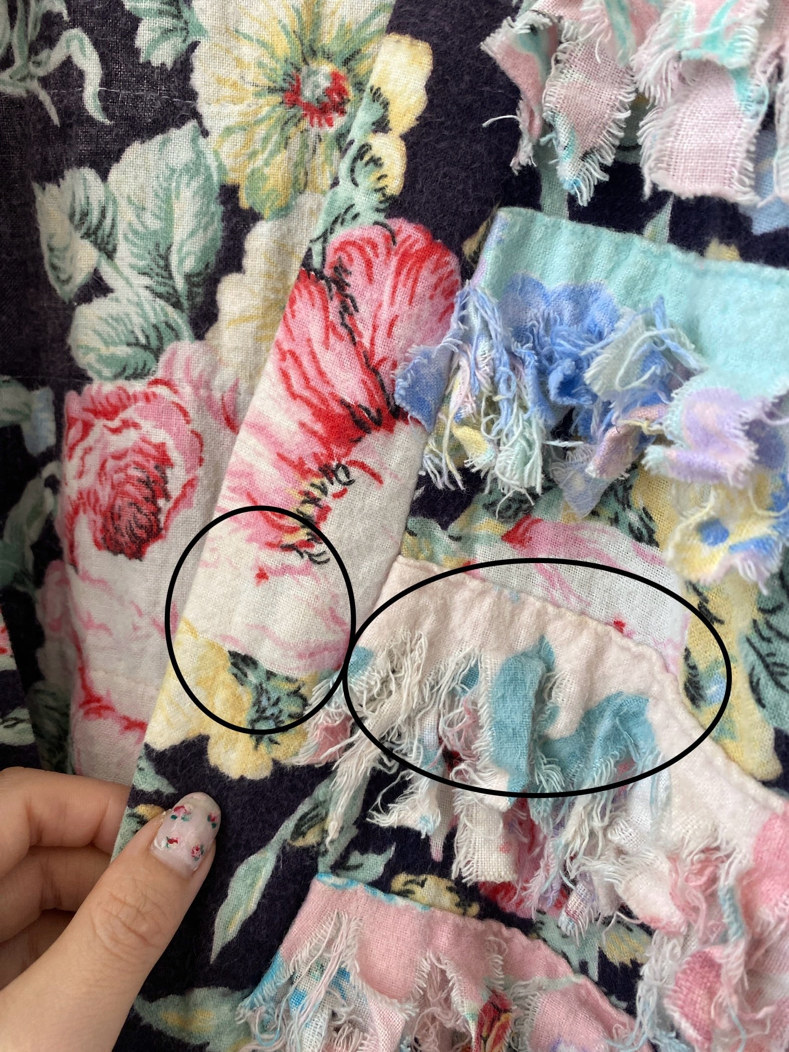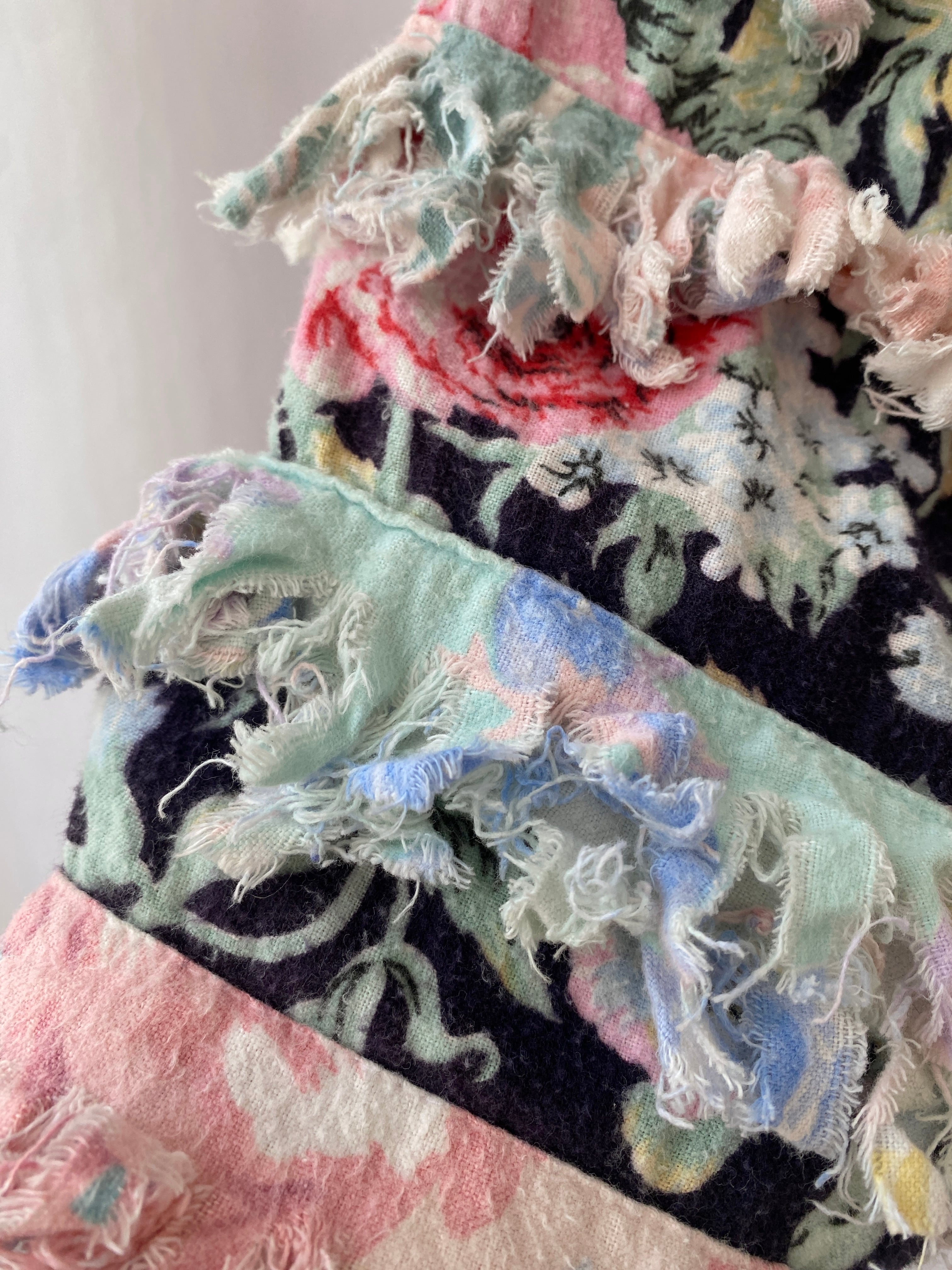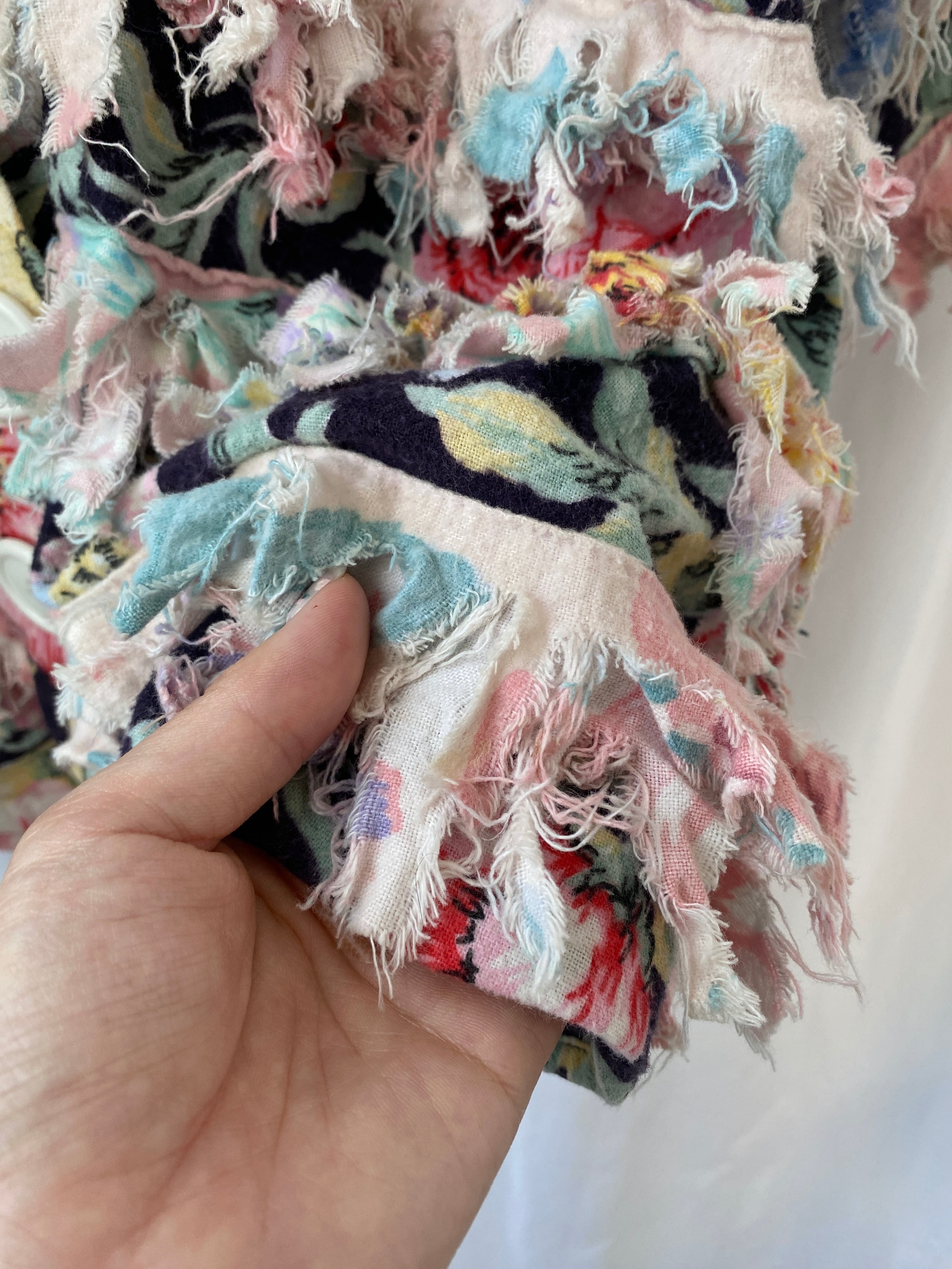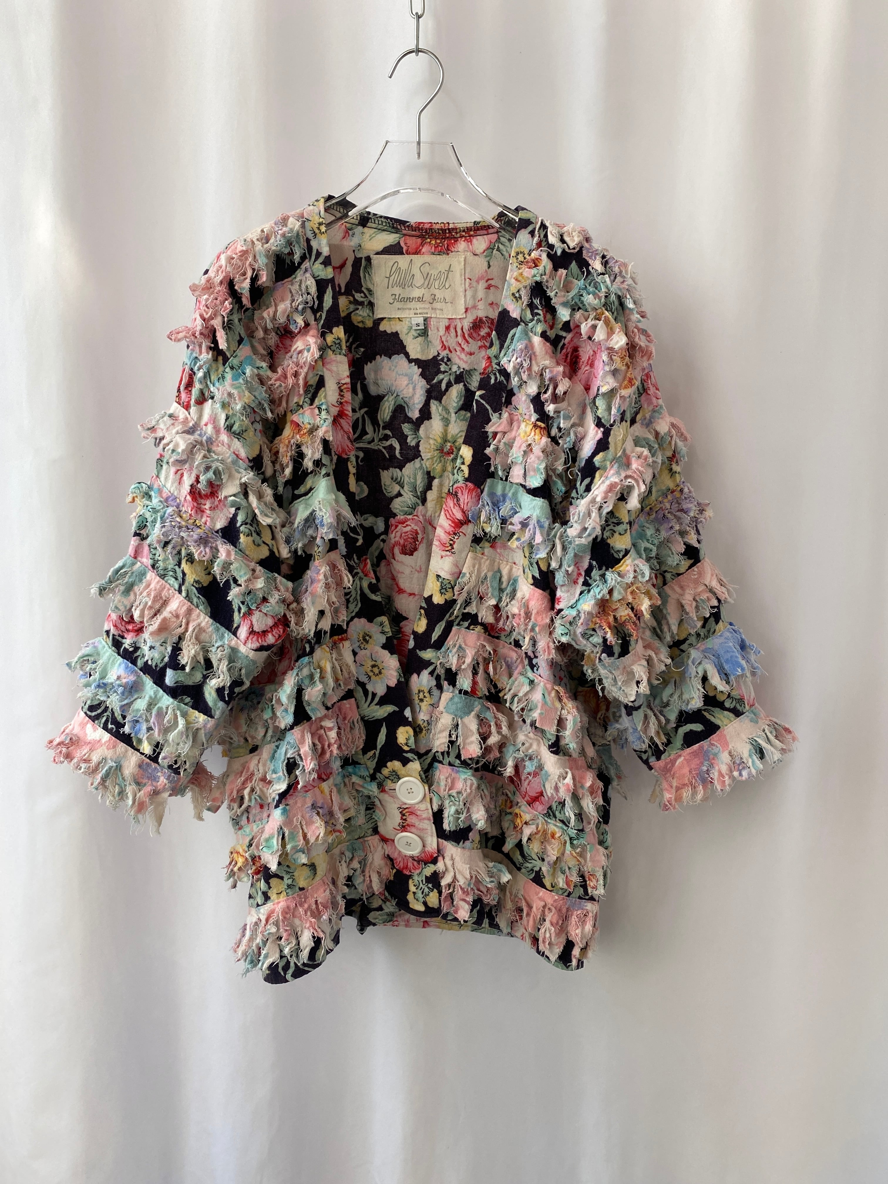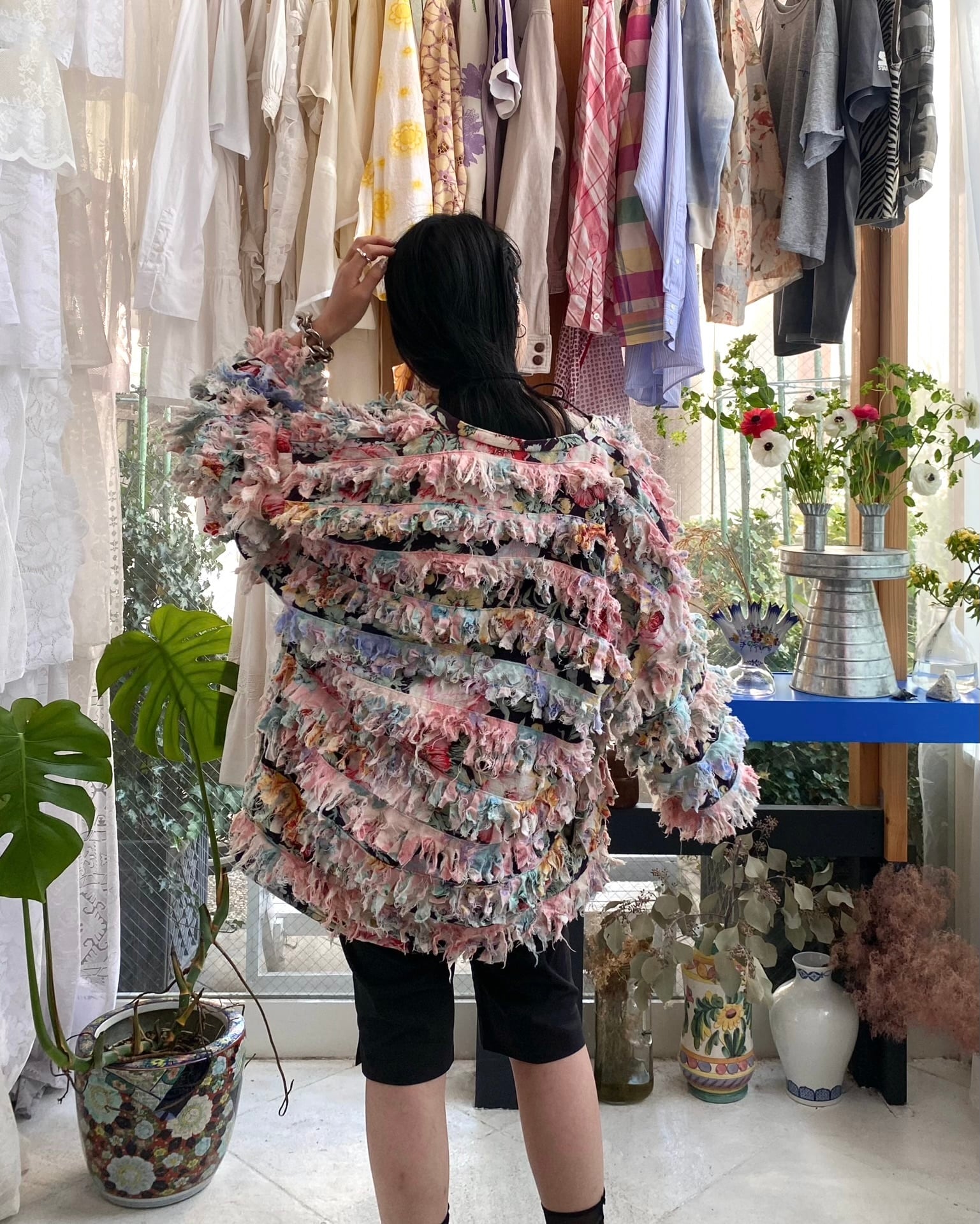 ブラックの花柄プリントベースにペールトーンのフリンジがミックスされた春らしくてパワフルなフリンジジャケット。