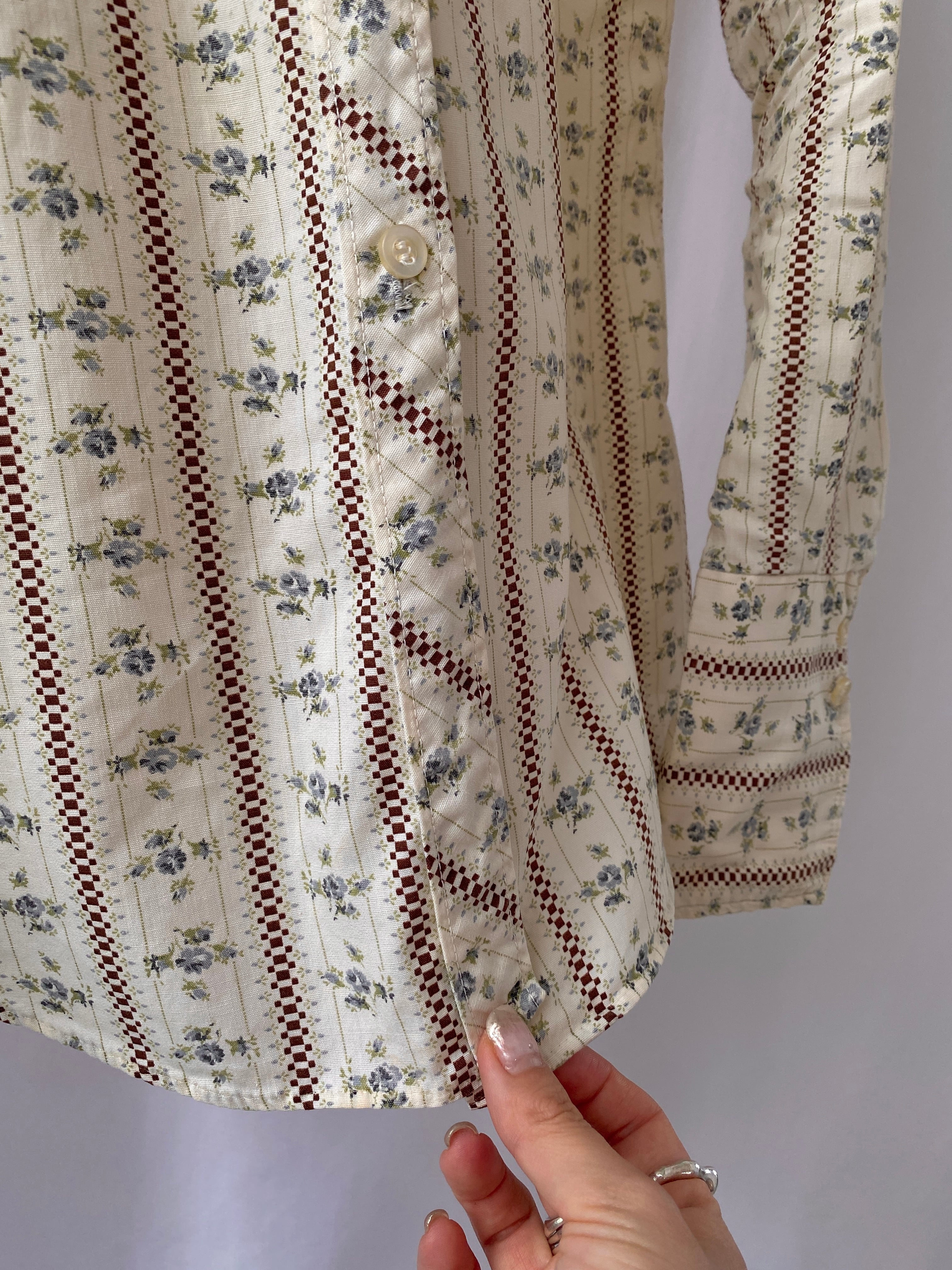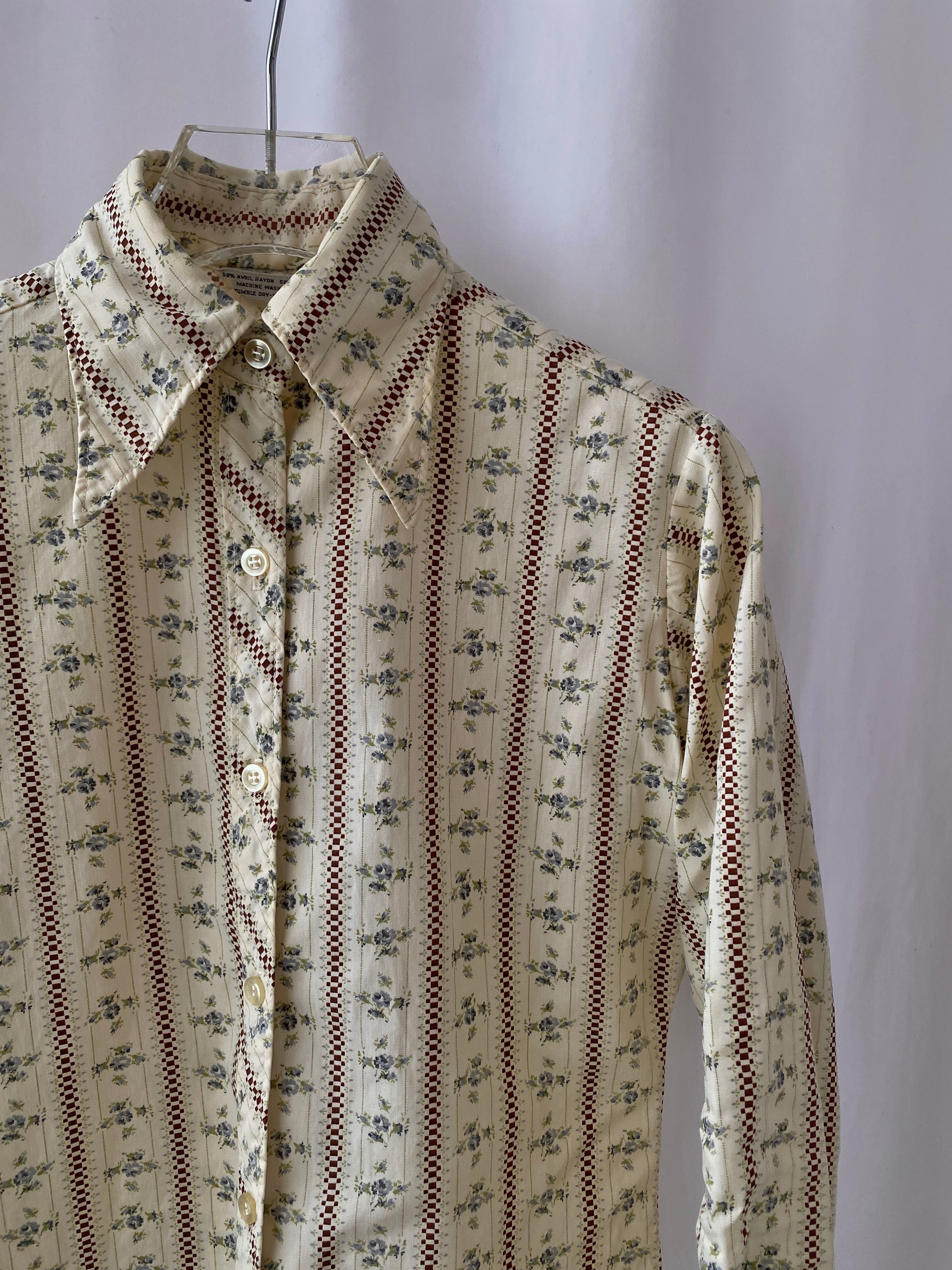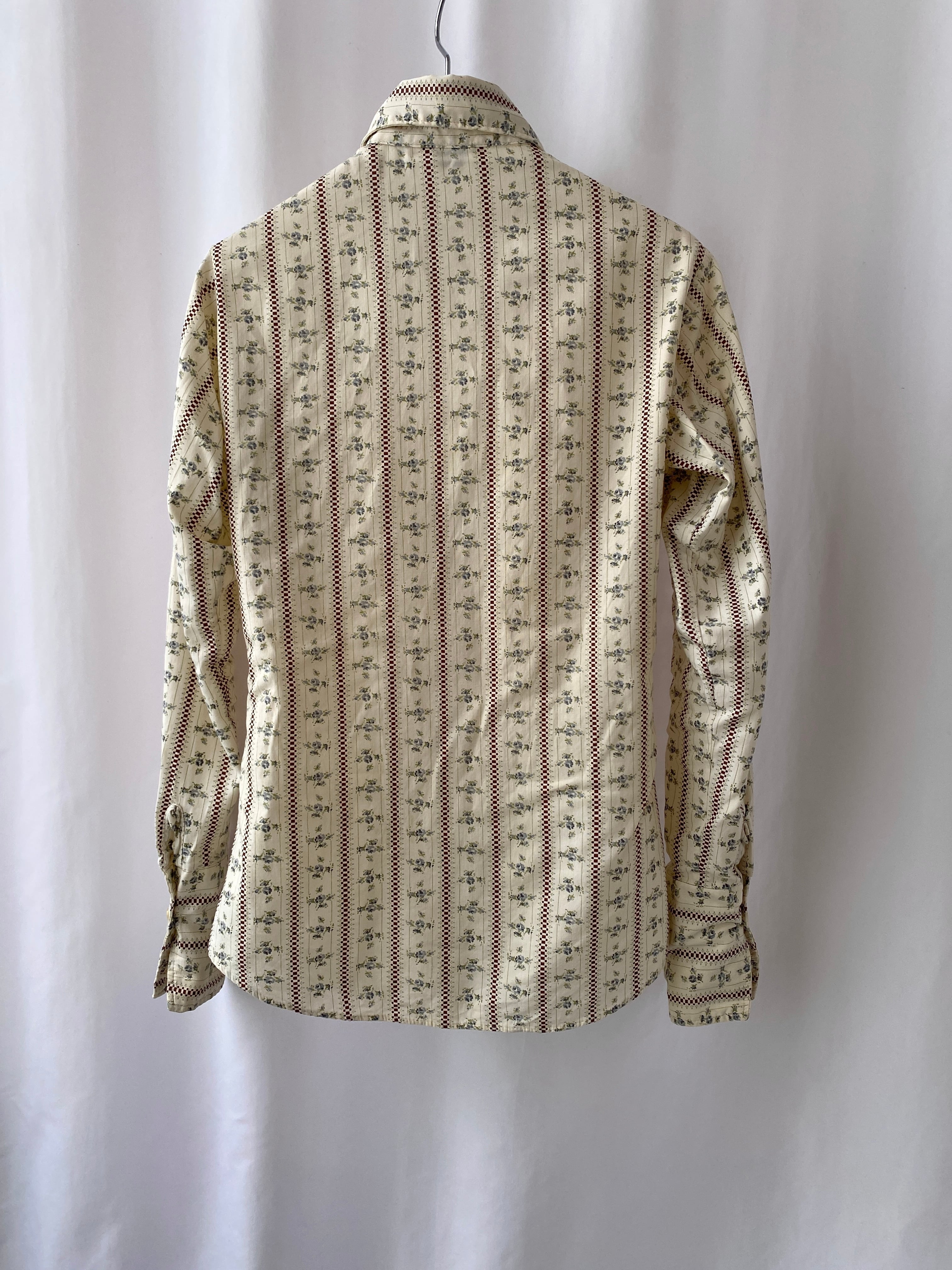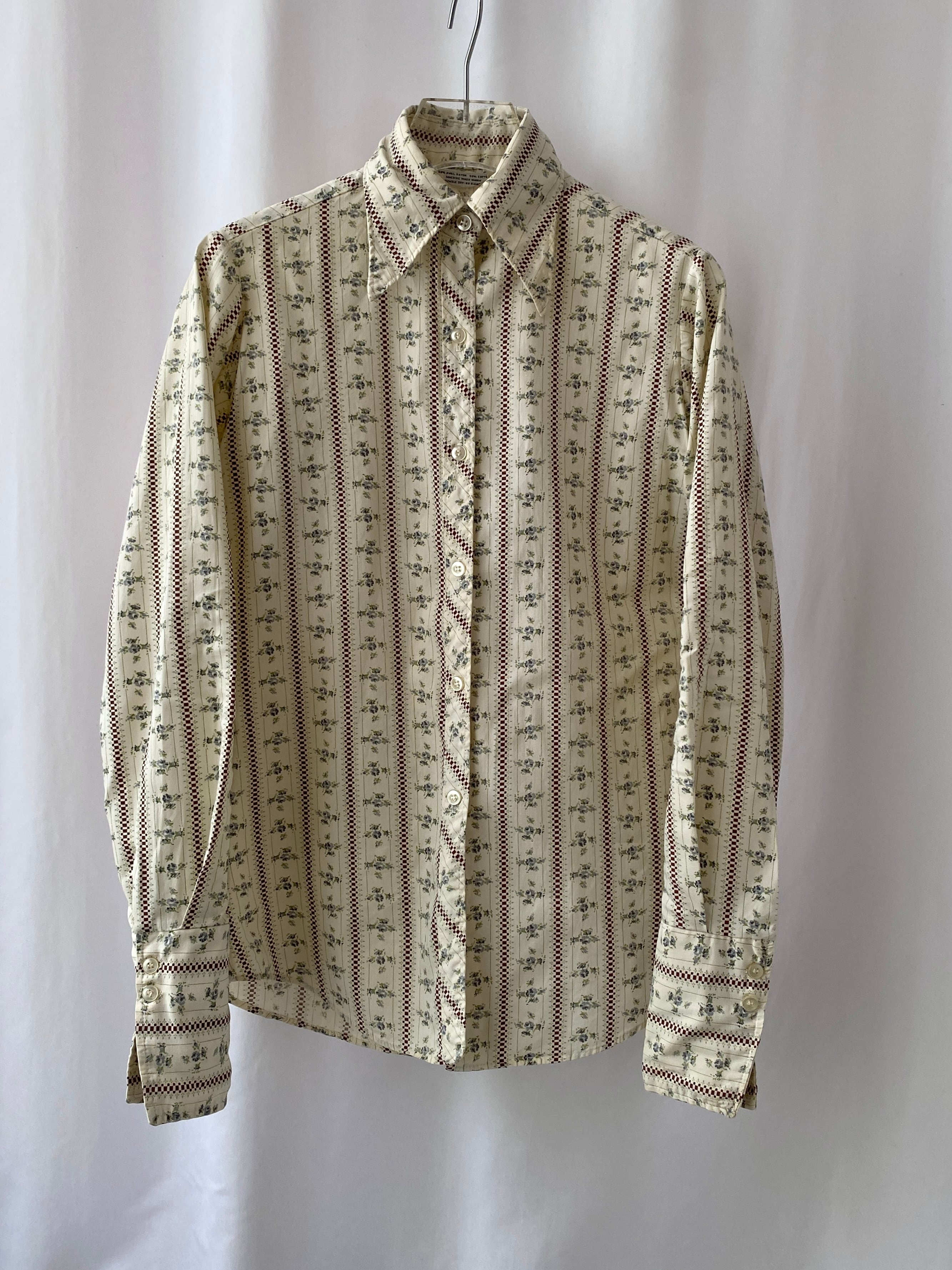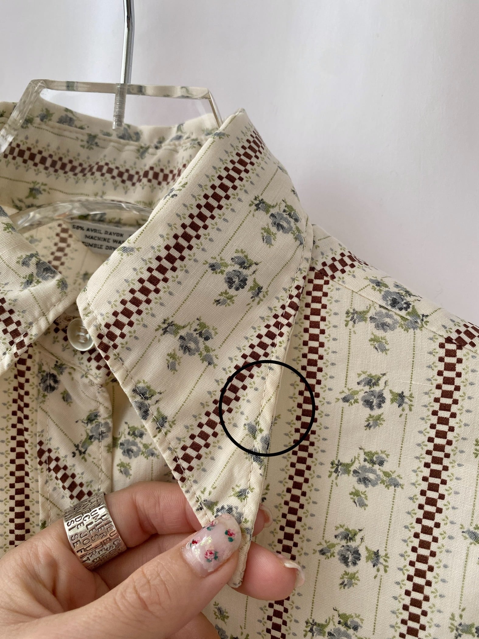 ほんのりシェイプされたウエストライン、ややツンがった襟、袖のカフスのディテールなど柄だけでなくレトロなディテールが詰まっています。