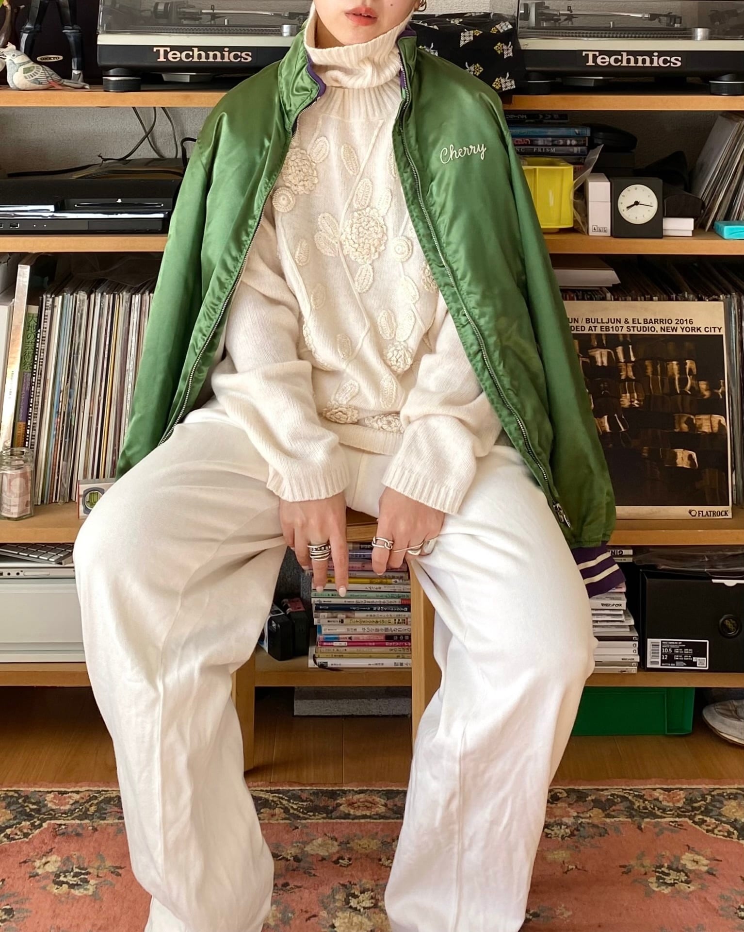 綺麗なカラーリングながら、メンズライクなアイテムと合わせるのがMAYIMらしさ。