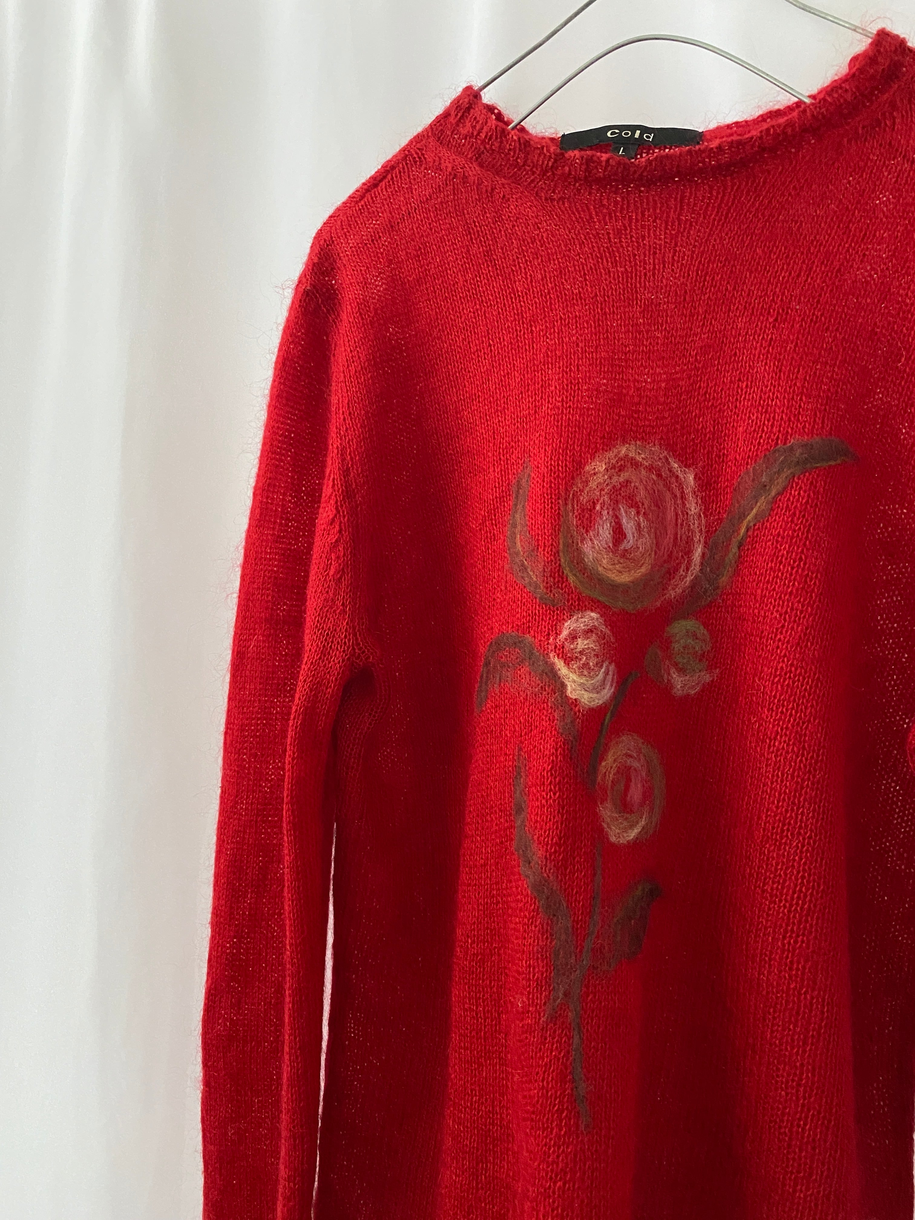 フラワーモチーフはフェルトの様にまとめた毛糸で柄を描く特殊な加工で、ボワっと浮き上がる雰囲気が幻想的。