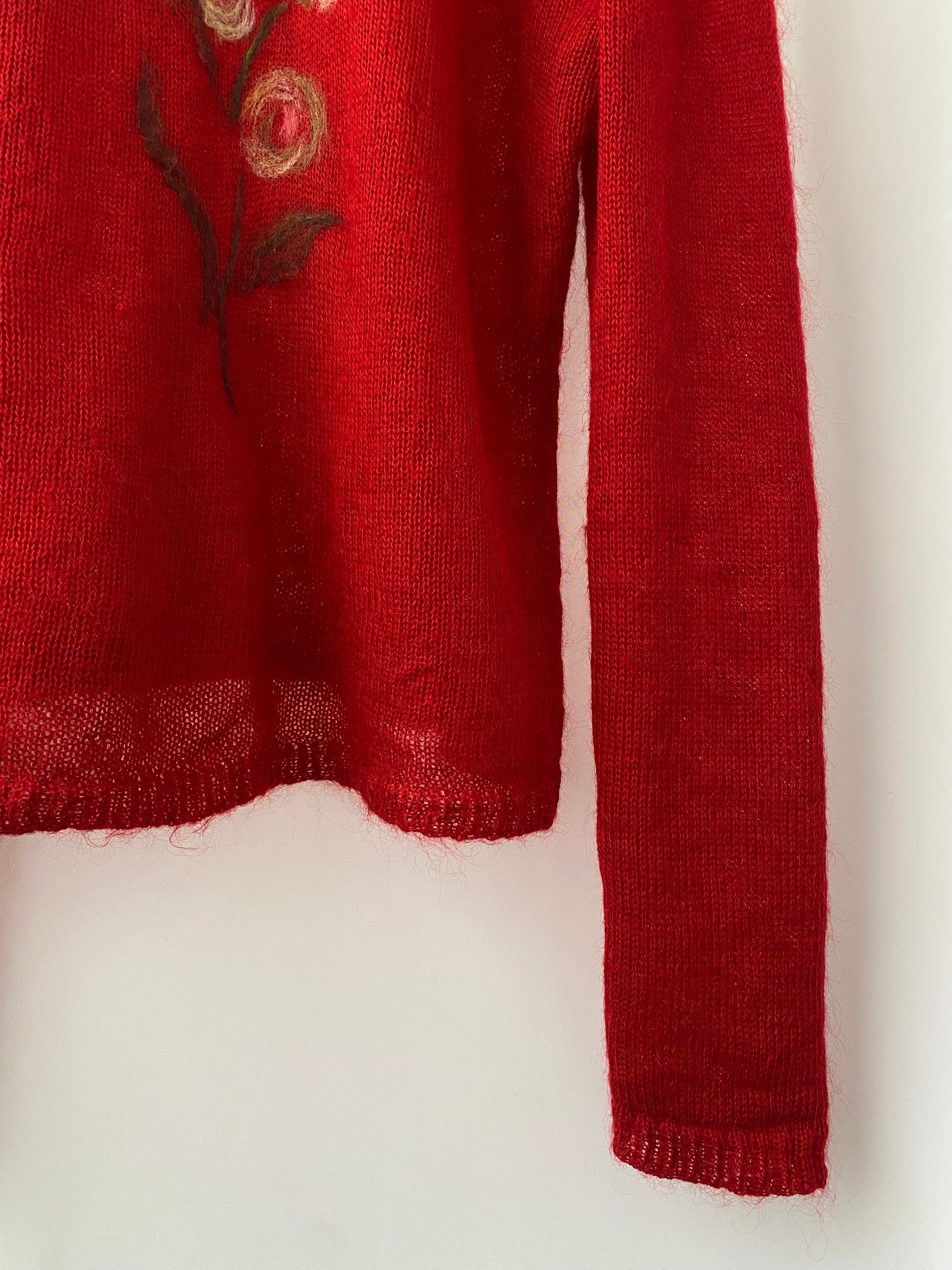 細い毛糸でローゲージで編まれているのでほんのり透け感があり、モヘアの毛足がフワッとしていて薄手ではありますが奥行きを感じます。