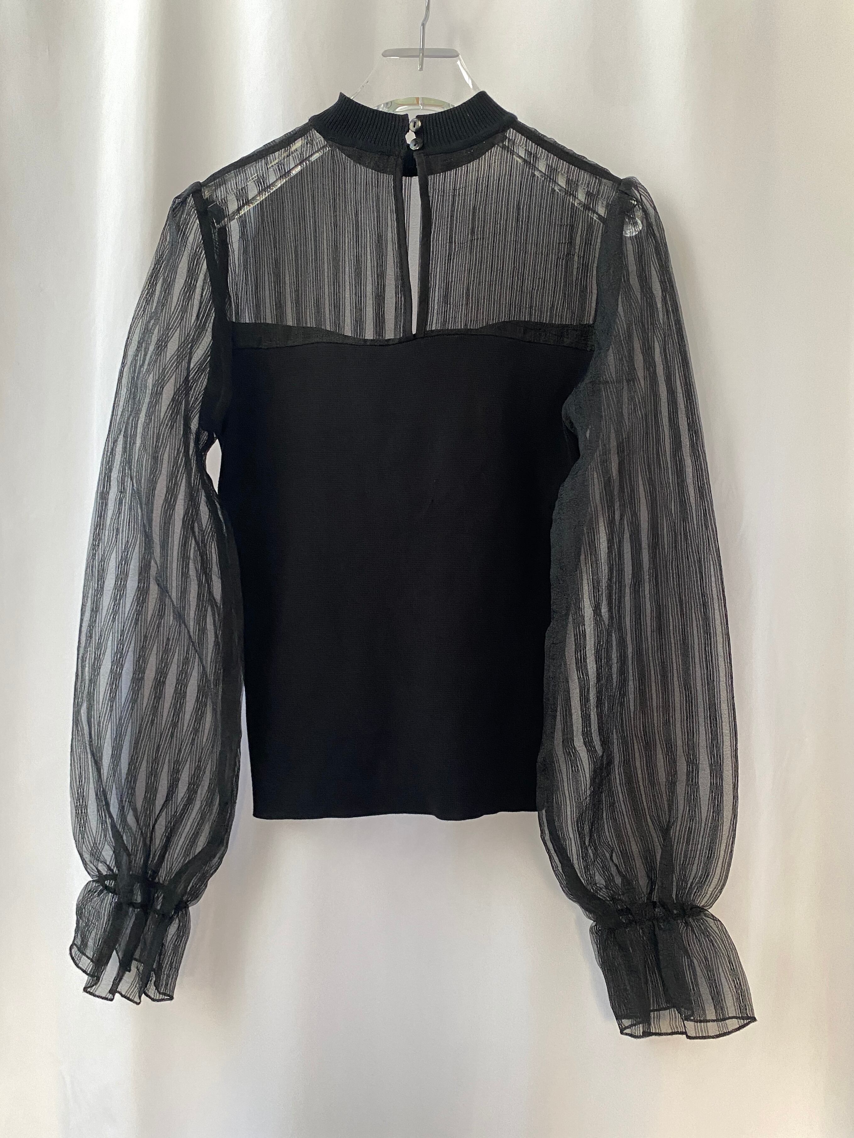 張りのあるオーガンジー素材はストライプ柄で透けすぎないのがポイント。袖にゴムが入っておりクラシックなパプラムデザインなのも良いですね◎
