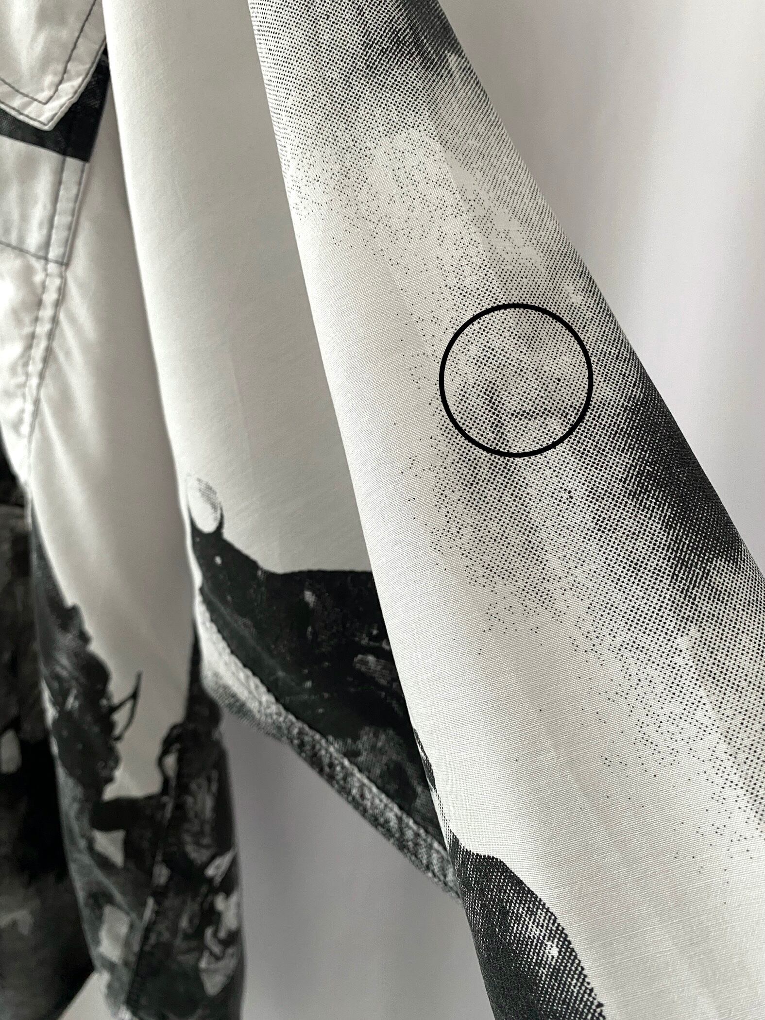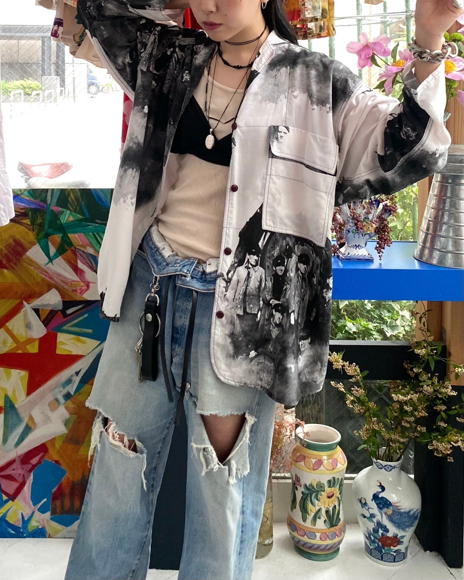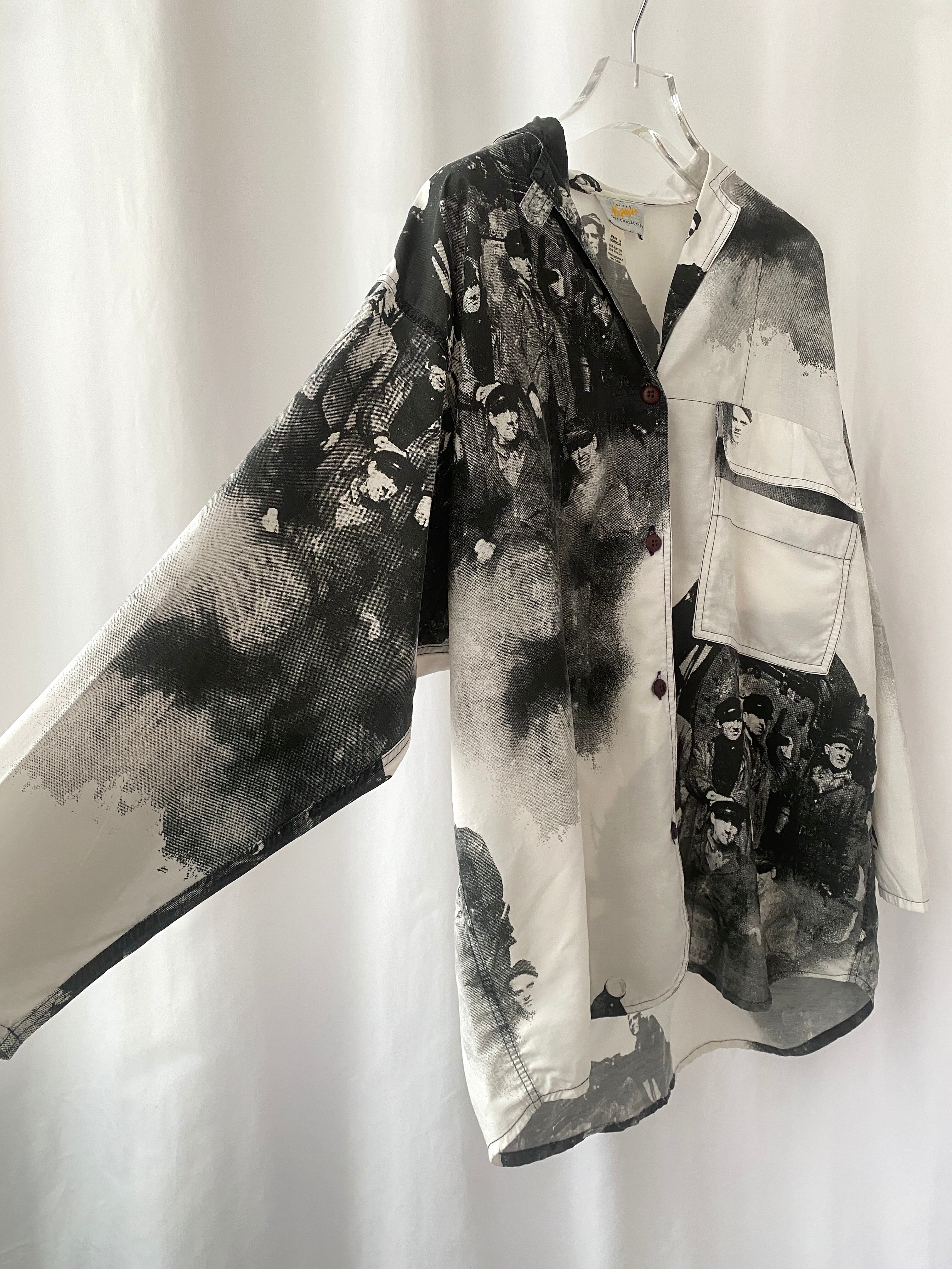 炭鉱夫たちのモノクロ写真を落とし込んだテキスタイルのレーヨンシャツ。