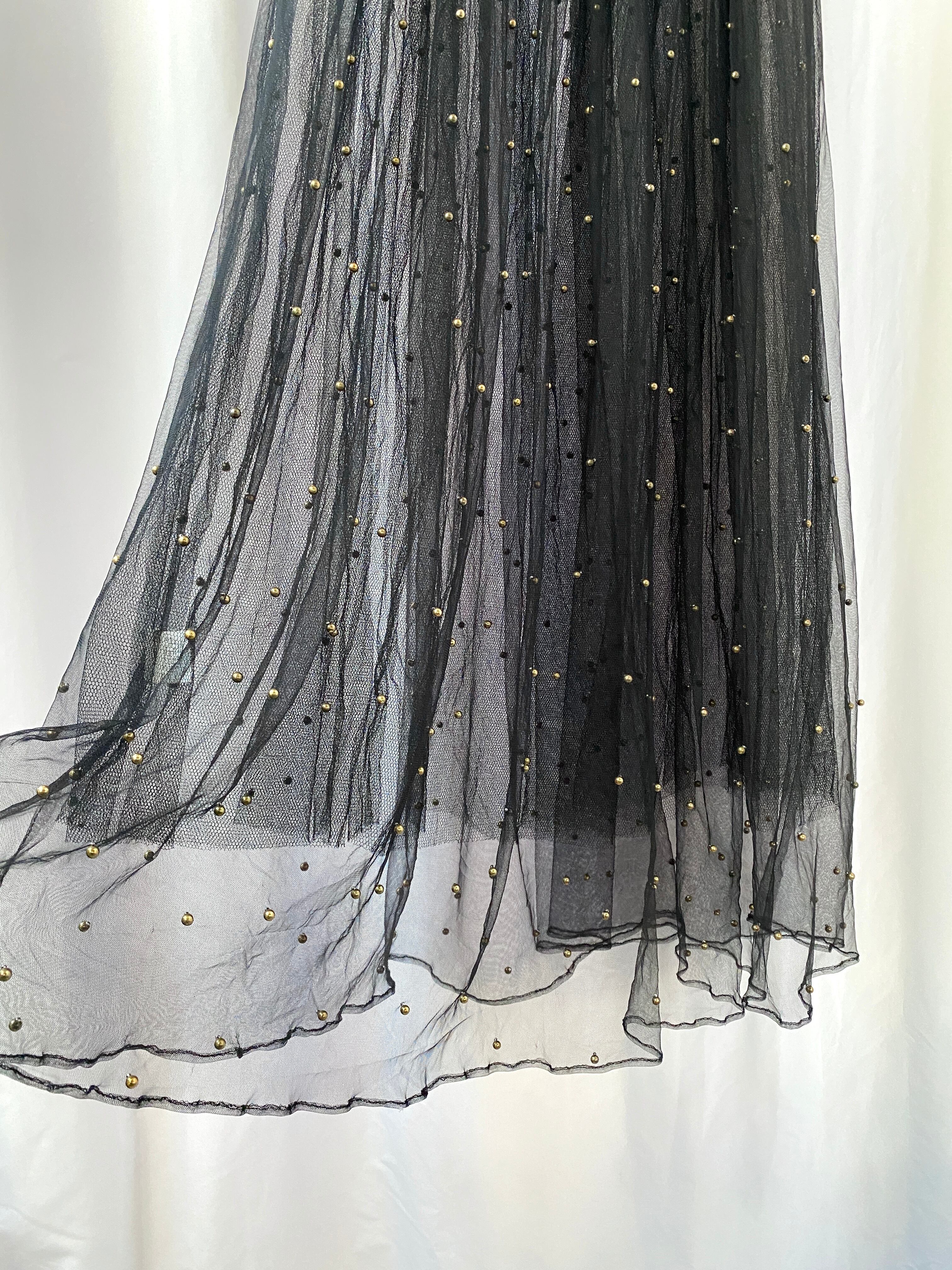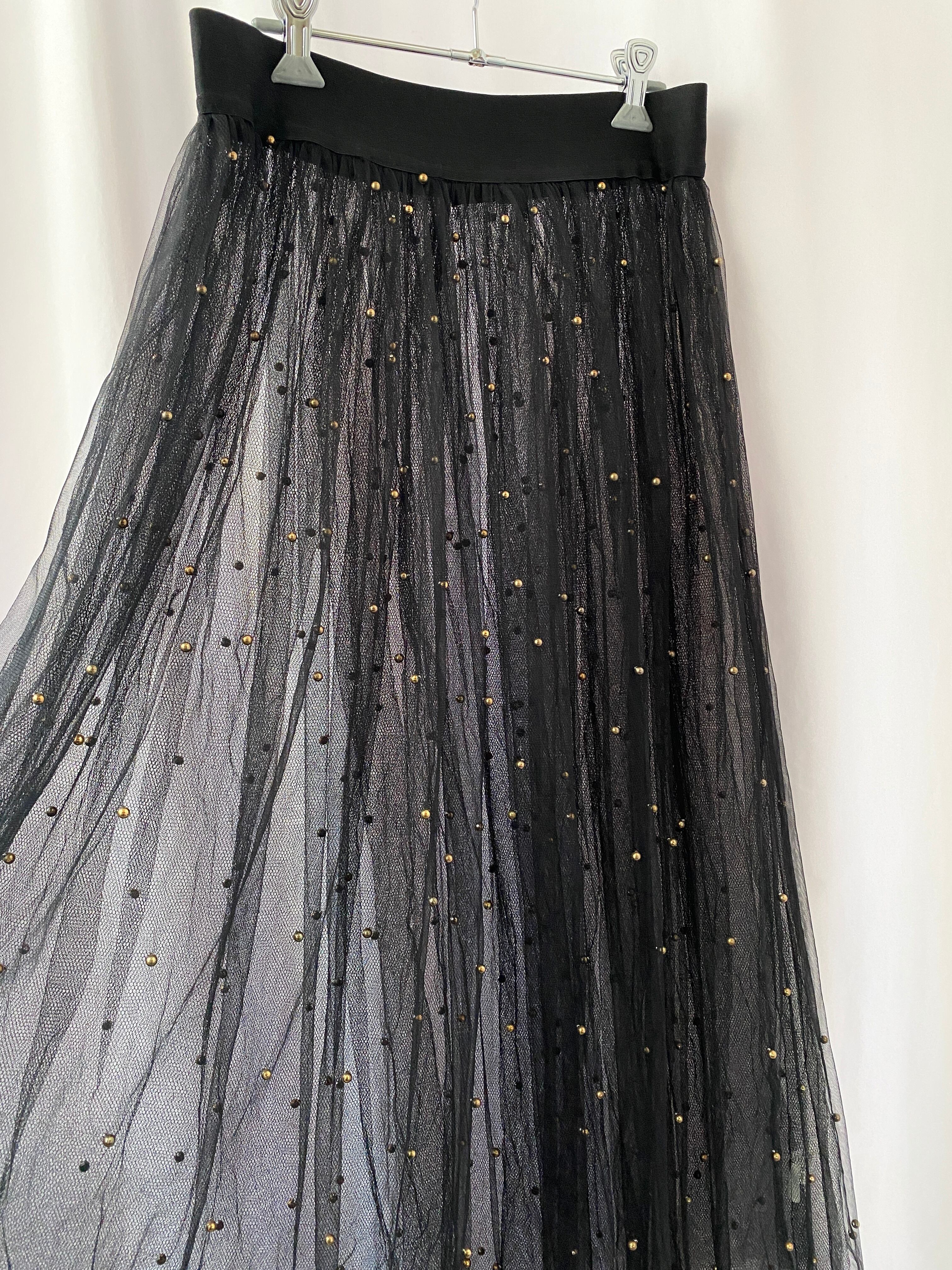 小さなゴールドパーツがあしらわれたチュールマキシスカート。