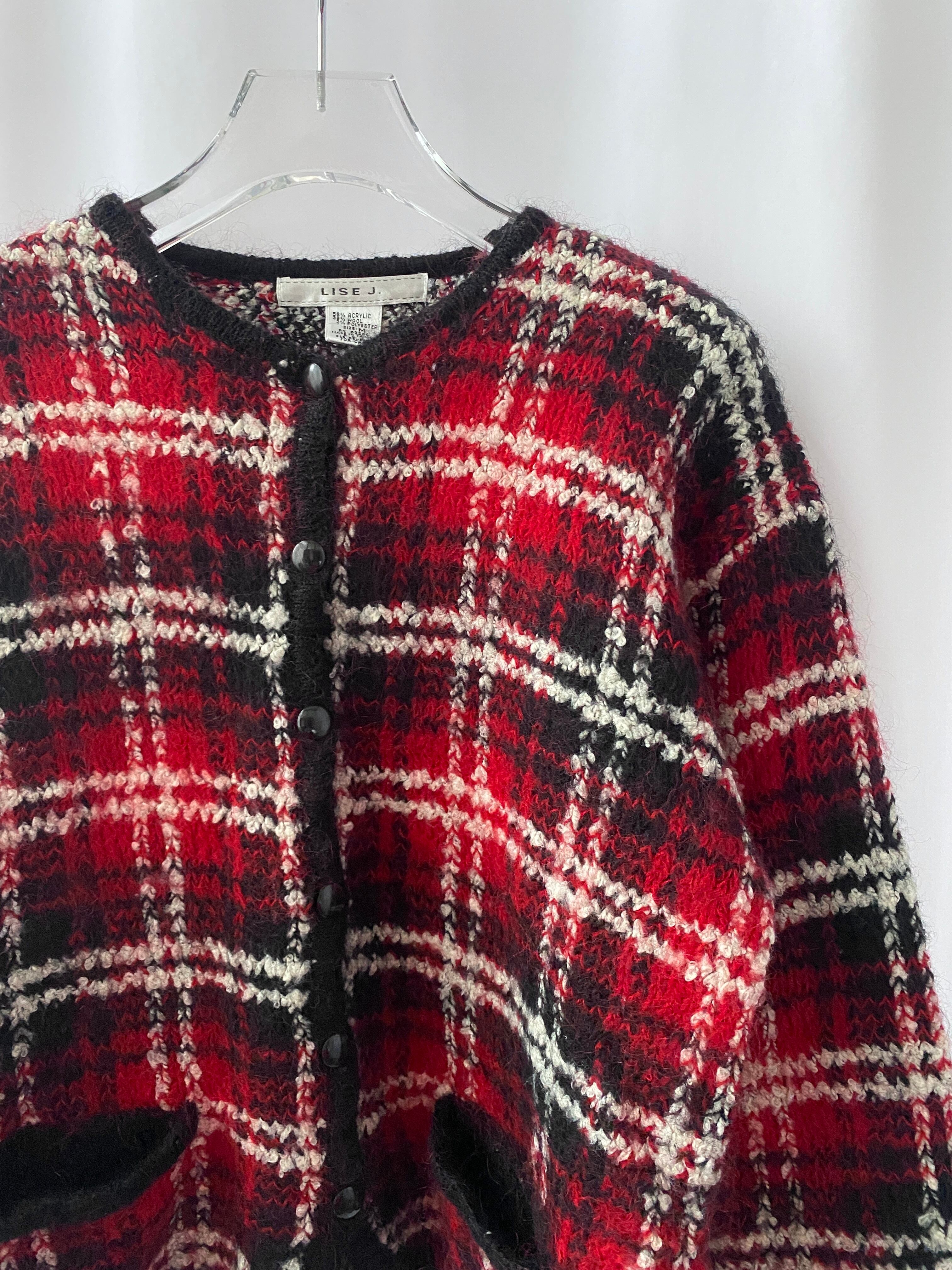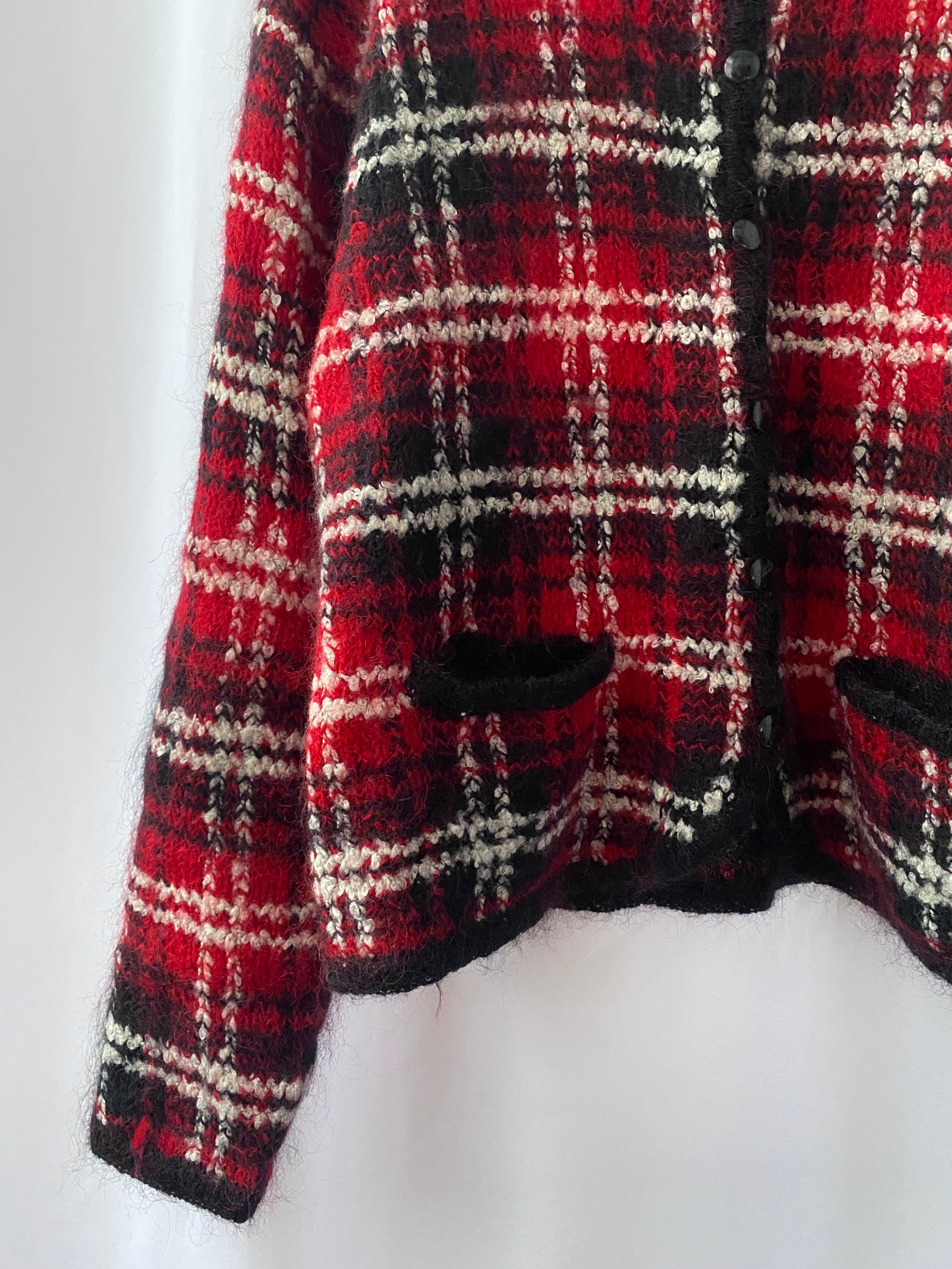 トレンドカラーの赤がメインのタータンチェック薄手ニットカーディガン。